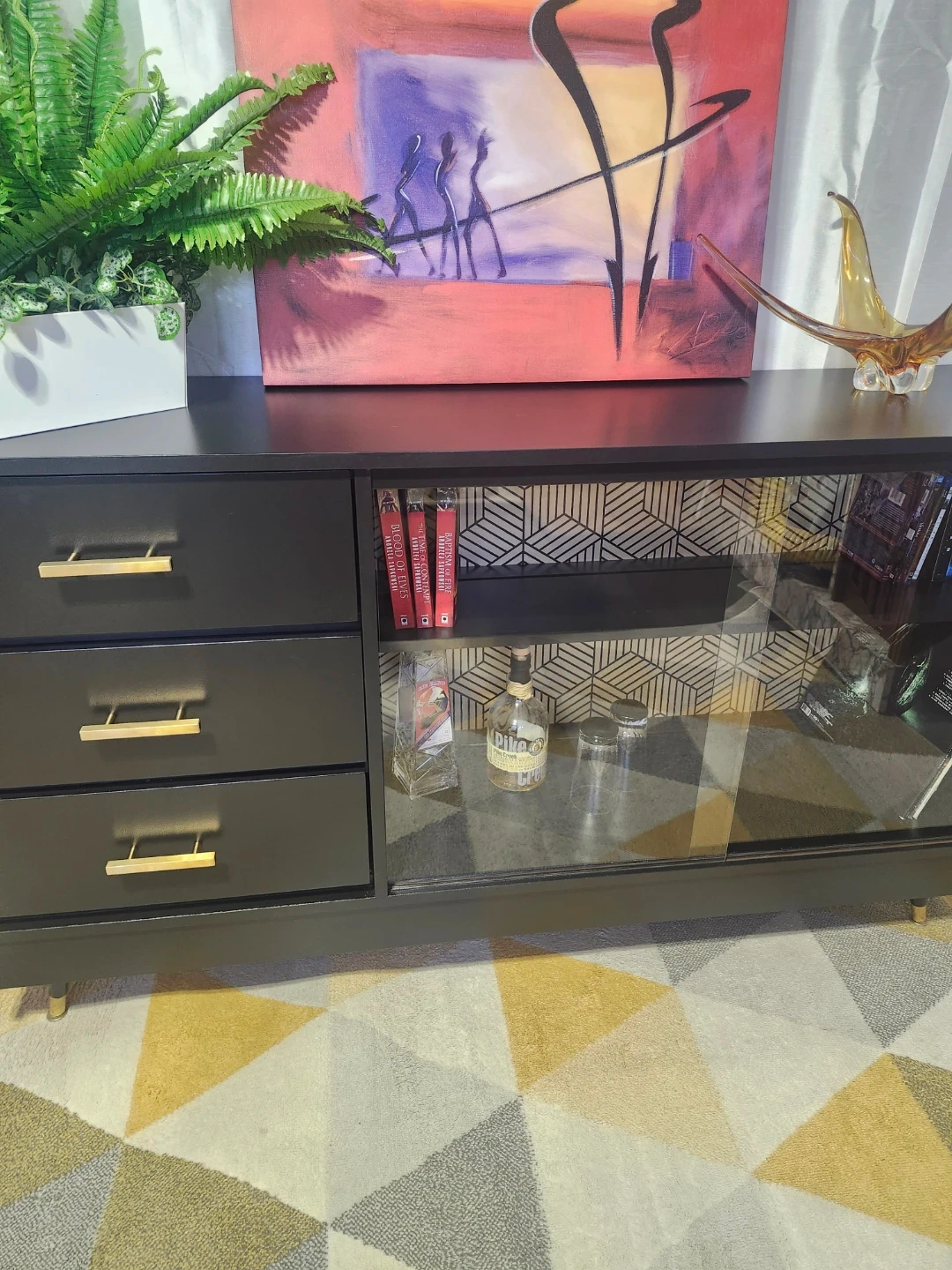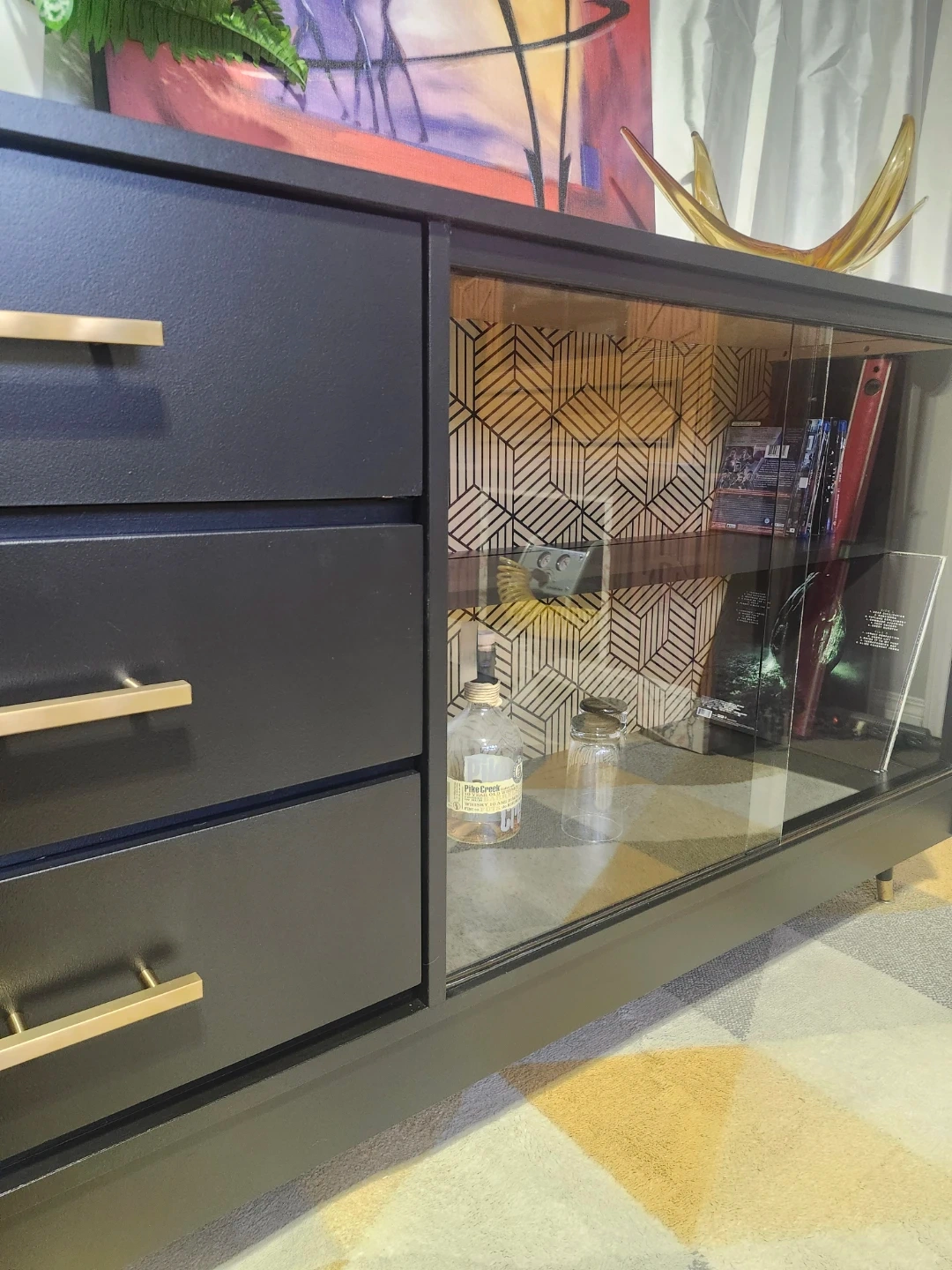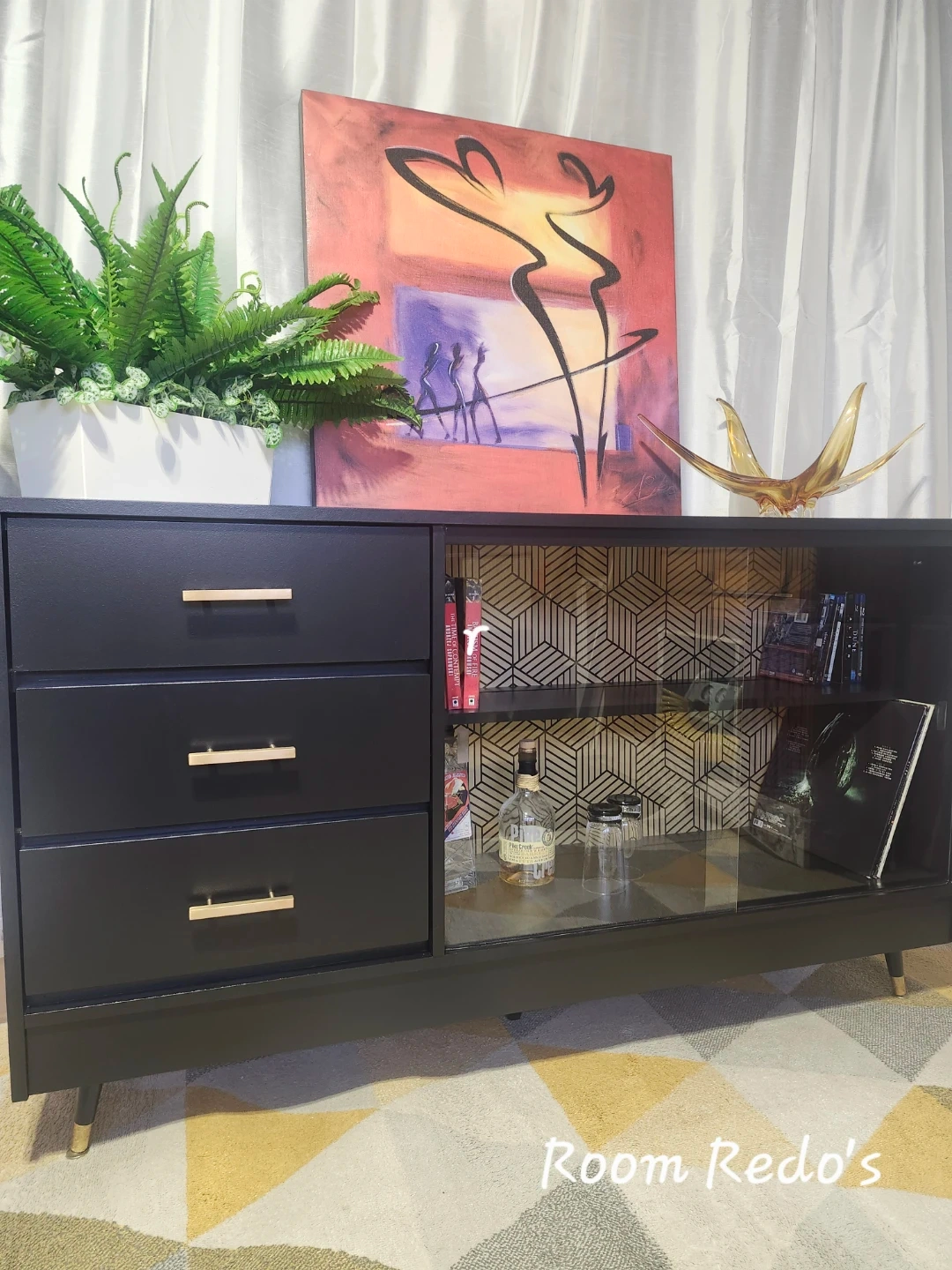 Redone in a mat black with fabulous wallpaper detail. All drawers slide perfectly, glass doors are perfect.