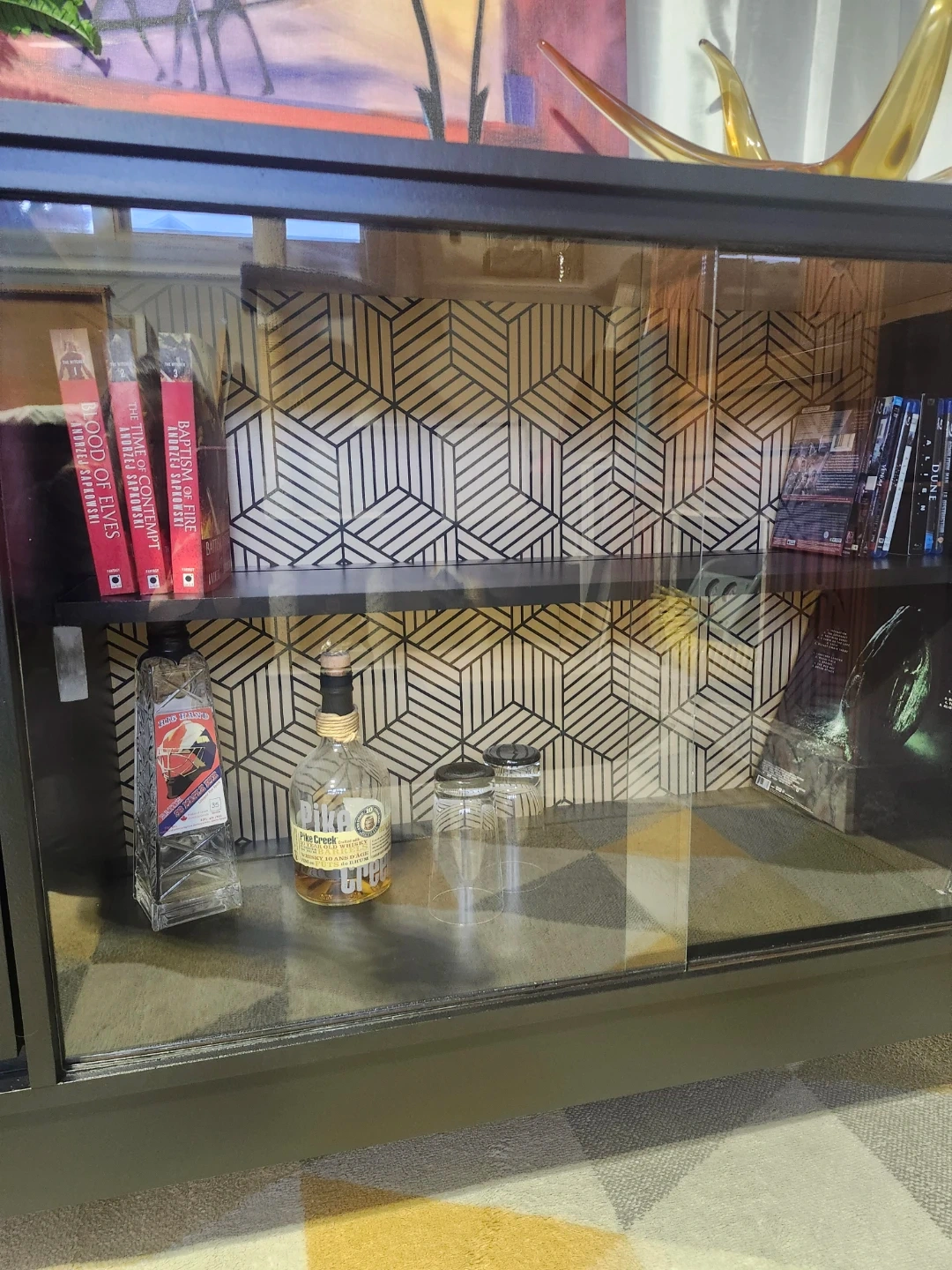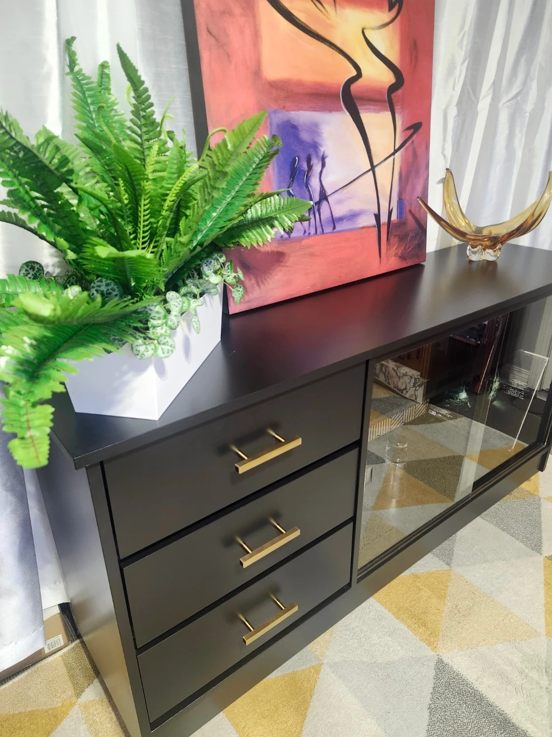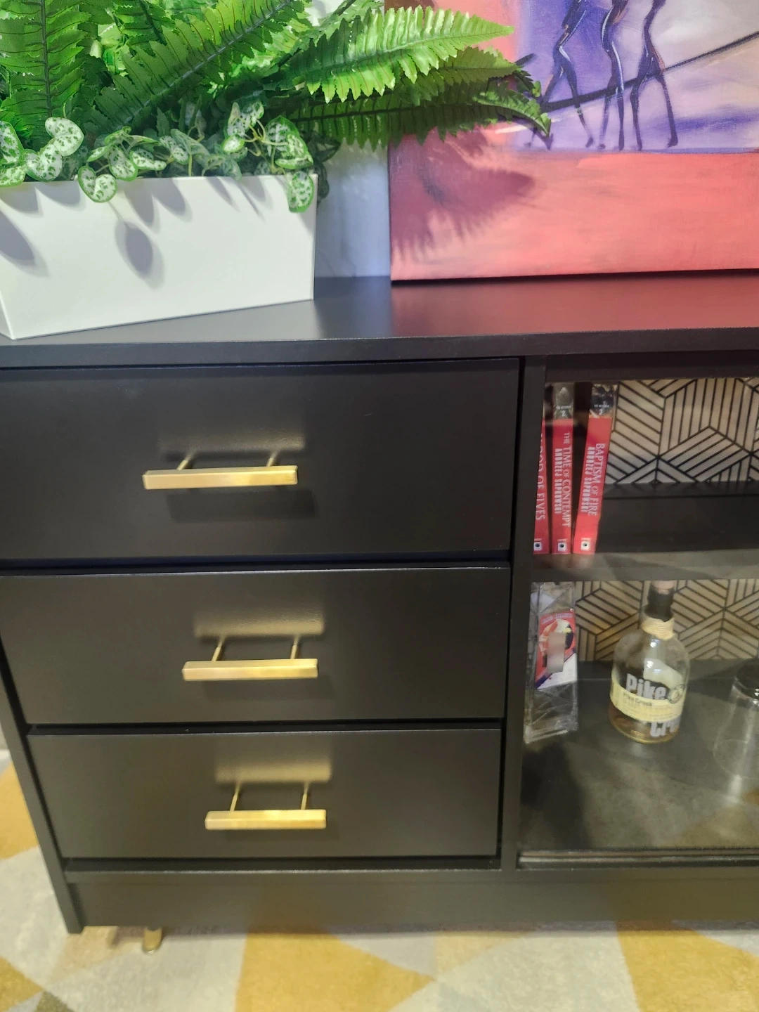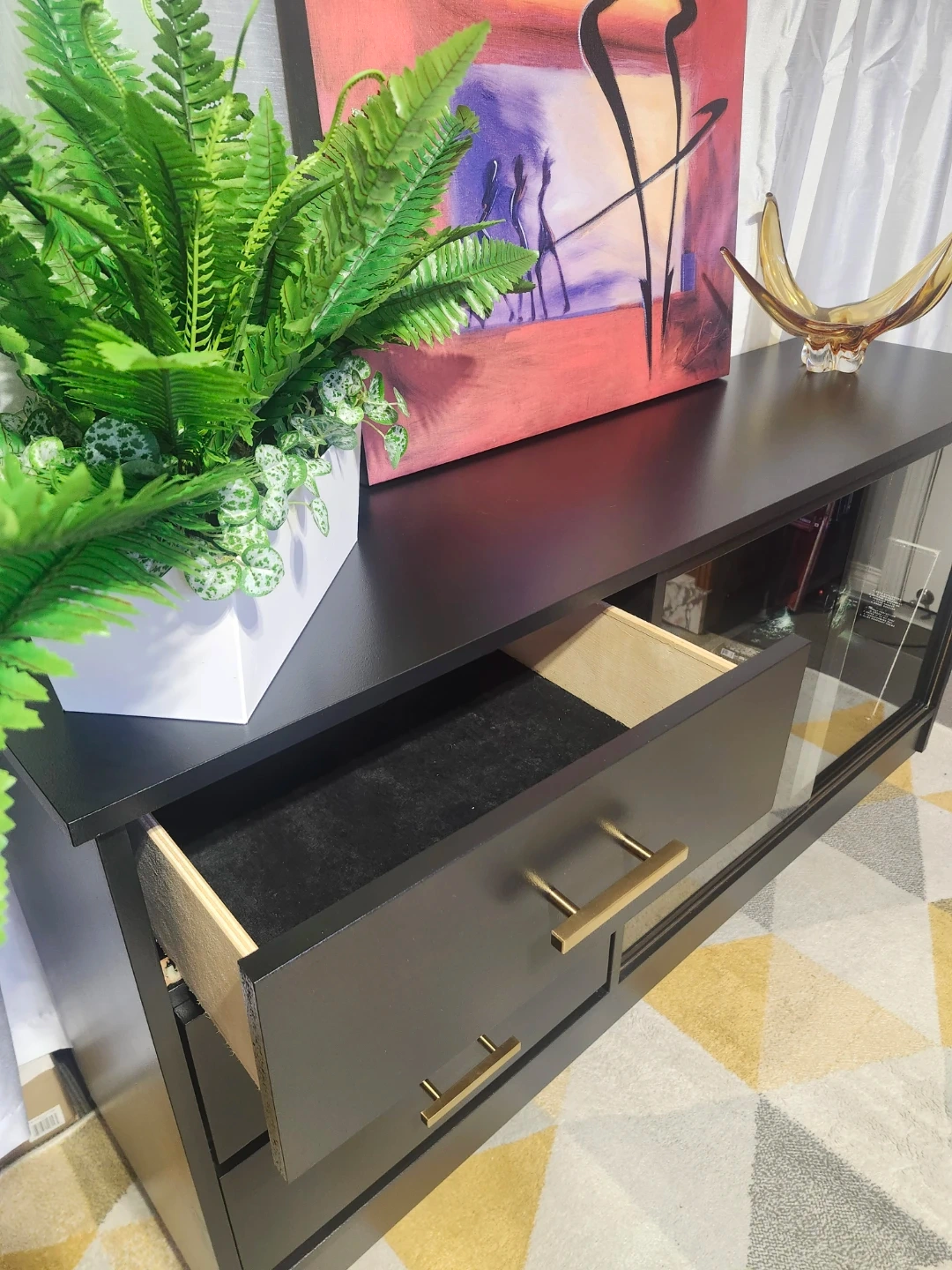 Redone in a mat black with fabulous wallpaper detail. All drawers slide perfectly, glass doors are perfect.