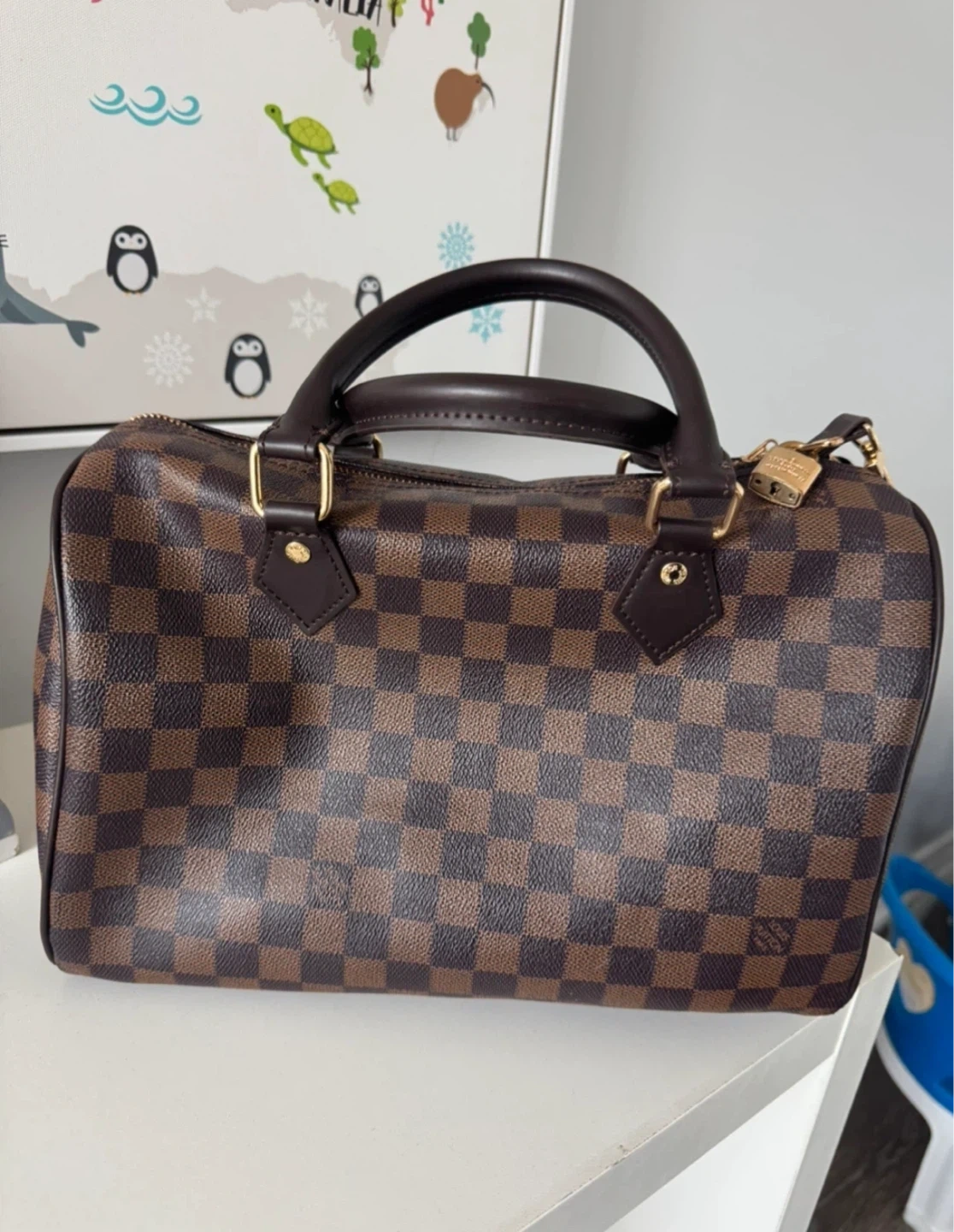 Authentic Louis Vuitton Speedy handbag in signature Damier Ebene canvas. This classic bag features rolled leather handles and a zip-top closure. It's a versatile piece for everyday use or travel.