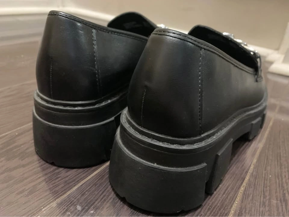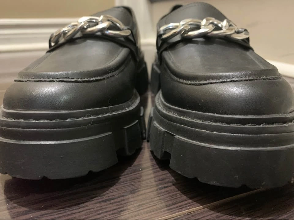 Brand new, never worn outside black faux leather loafers with silver chain detail. Size is visible on the insole. They have thick, heavy chunky soles. There are some minor scratches on the leather. Pickup at Chingacousy & Williams in Brampton.
