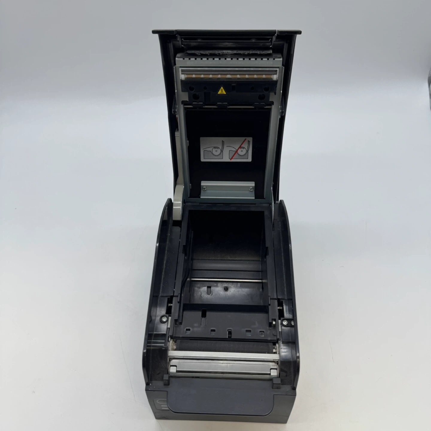 The printer shows normal signs of previous use such as minor scratches and wear. The inside paper compartment is clean, and all connectors and locks are intact.