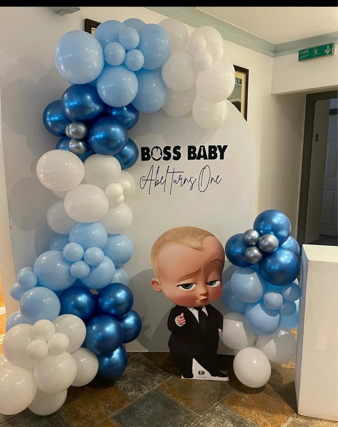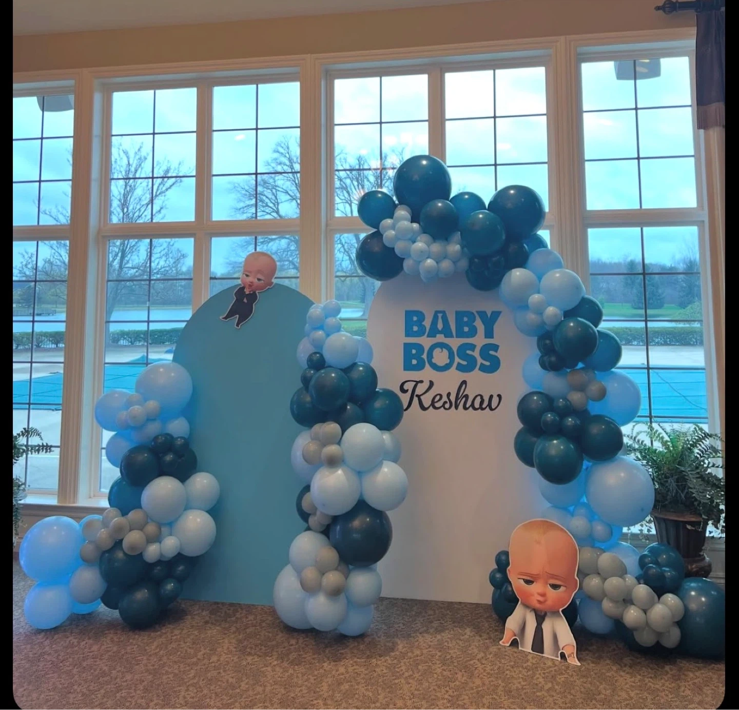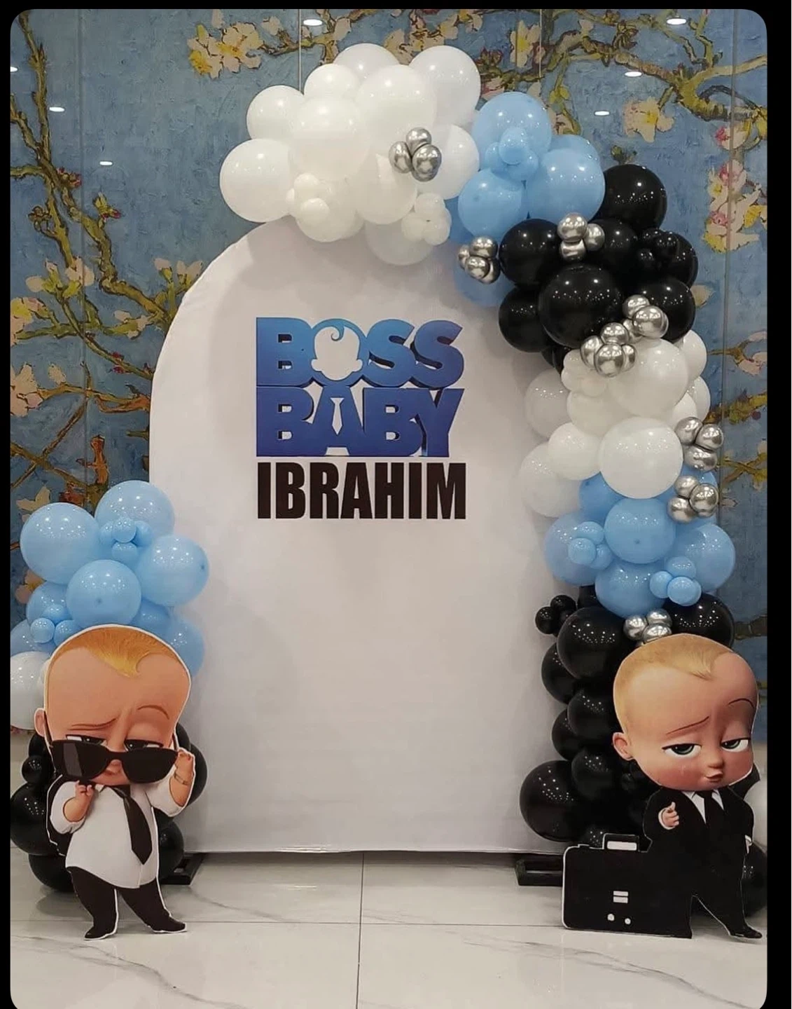 ‘Boss Baby' themed backdrop and balloon arch for a birthday party. Features popular characters and can be personalized with names like Ibrahim, Keshav, or Abel. Perfect for celebrating a one-year-old's special day or any 'Boss Baby' fan's event! We provide balloon decoration service delivery setup and backdown included