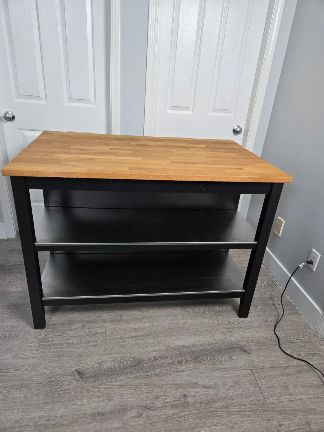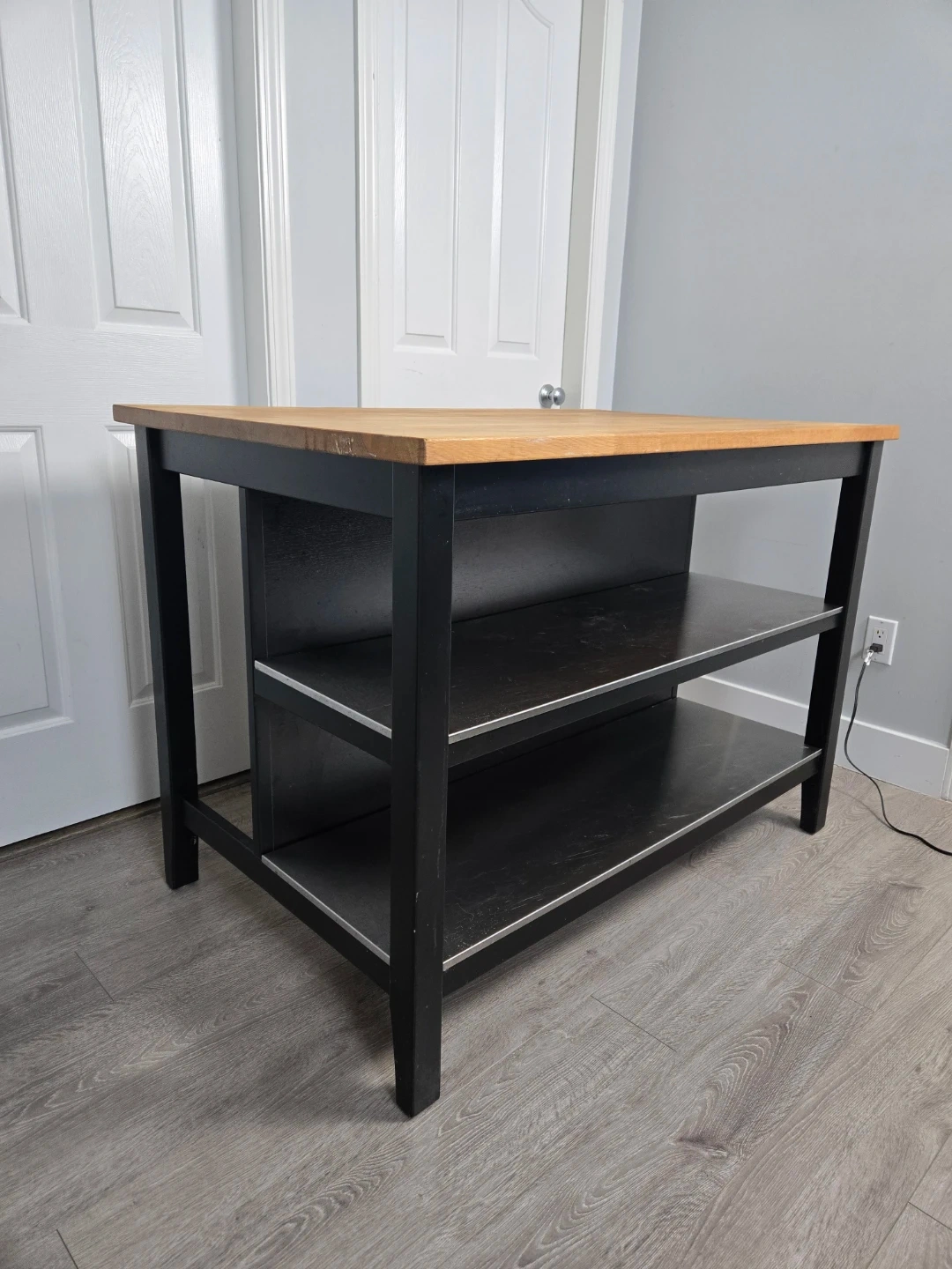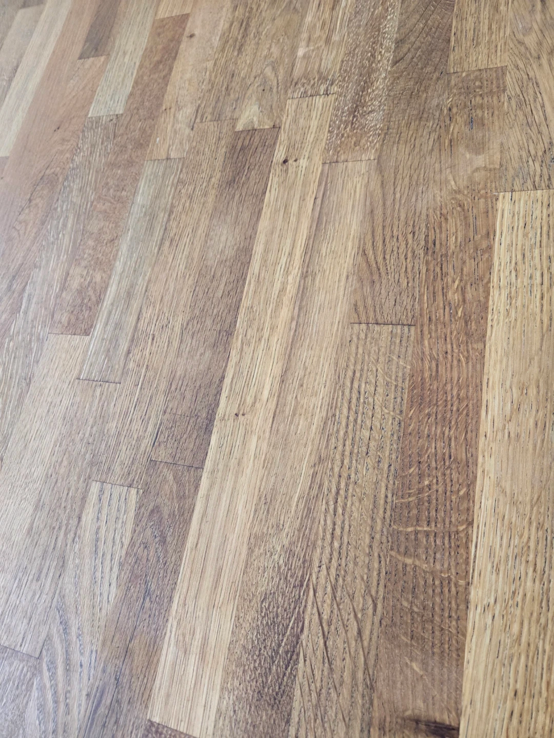 The butcher block has been sanded down smooth. Premium oils and waxes have been applied restoring it to perfect condition.