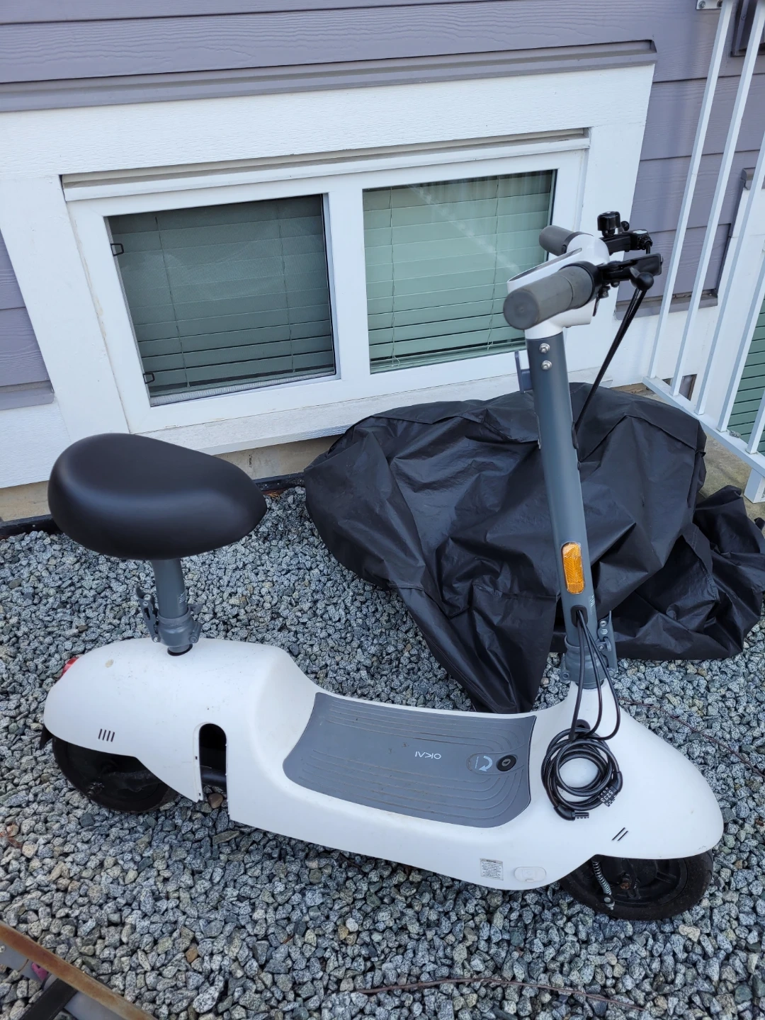 This is an OKAI electric scooter with a seat. It has a total mileage of 336 miles. The scooter comes with two keys for operation.