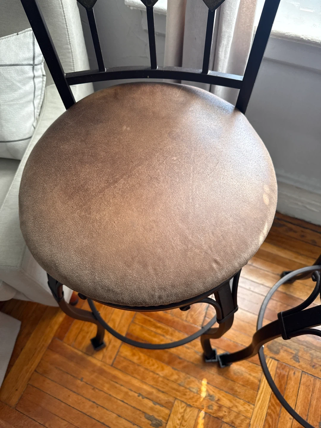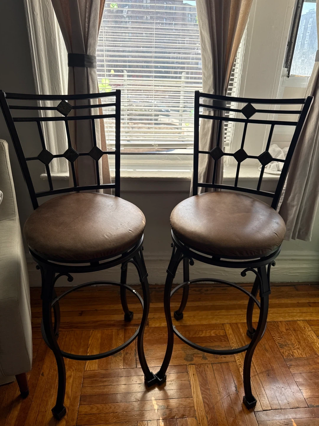 Set of two metal frame bar stools with brown upholstered seats and decorative metal backs. The frames are dark brown and feature curved legs with a circular footrest. These stools would be great for a kitchen island or bar area. Upholstery has a few stains. Feet need replacement felt