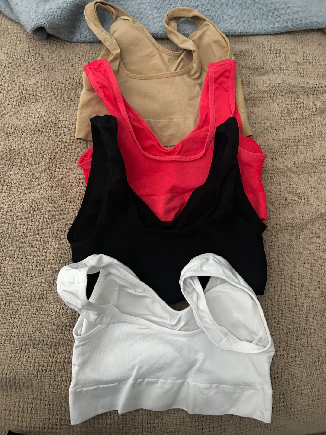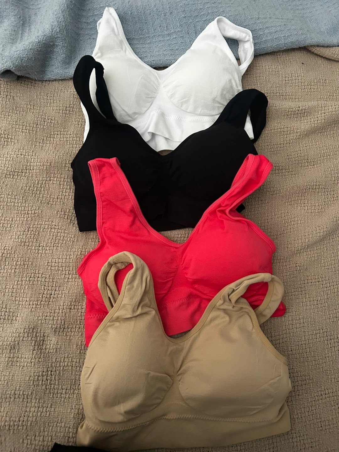 Selling a set of 4 comfortable seamless bras in assorted colours. Includes white, black, red, and beige. Great for everyday wear!