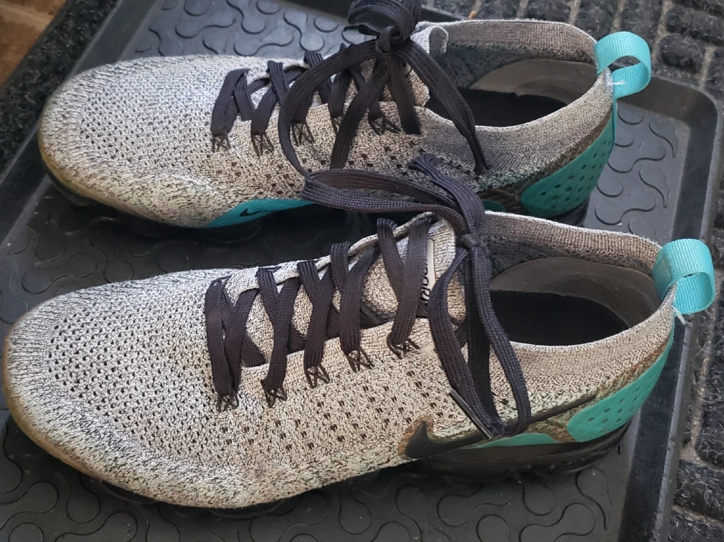 Selling a pair of Nike Air VaporMax 2.0 Flyknit sneakers in grey and teal. They are in good condition, see the size in the last picture as well.