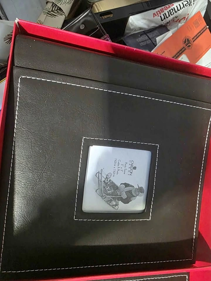 Black photo album and frame set. Front cover has a 3x3 inch photo frame for your favorite picture. White pages for all your photos.