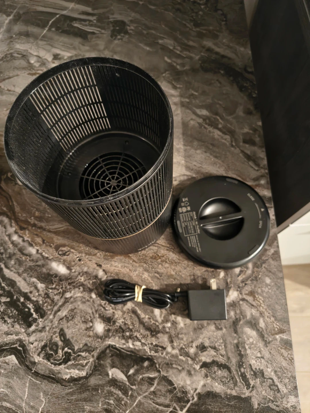 Black Airtok air purifier. It includes the main unit and its power adapter. The unit has a timer function with 2H, 4H, and 8H settings.