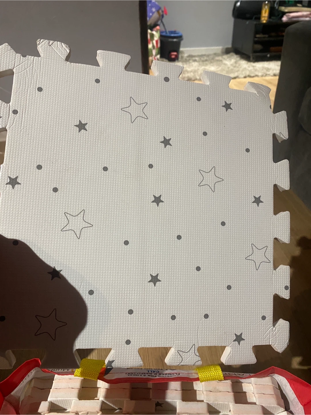 This is a set of interlocking foam play mat tiles, designed with a cute star and dot pattern. They're made of soft, durable foam, great for creating a safe play area for kids. The interlocking design makes them easy to assemble and customize.