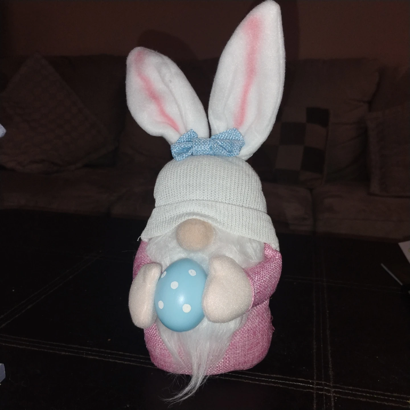 This adorable gnome is dressed for Easter with bunny ears and a blue egg! It's got a fuzzy white beard and a pink textured outfit. The hat has a knitted look with a blue bow. It's a charming decoration for the spring season!