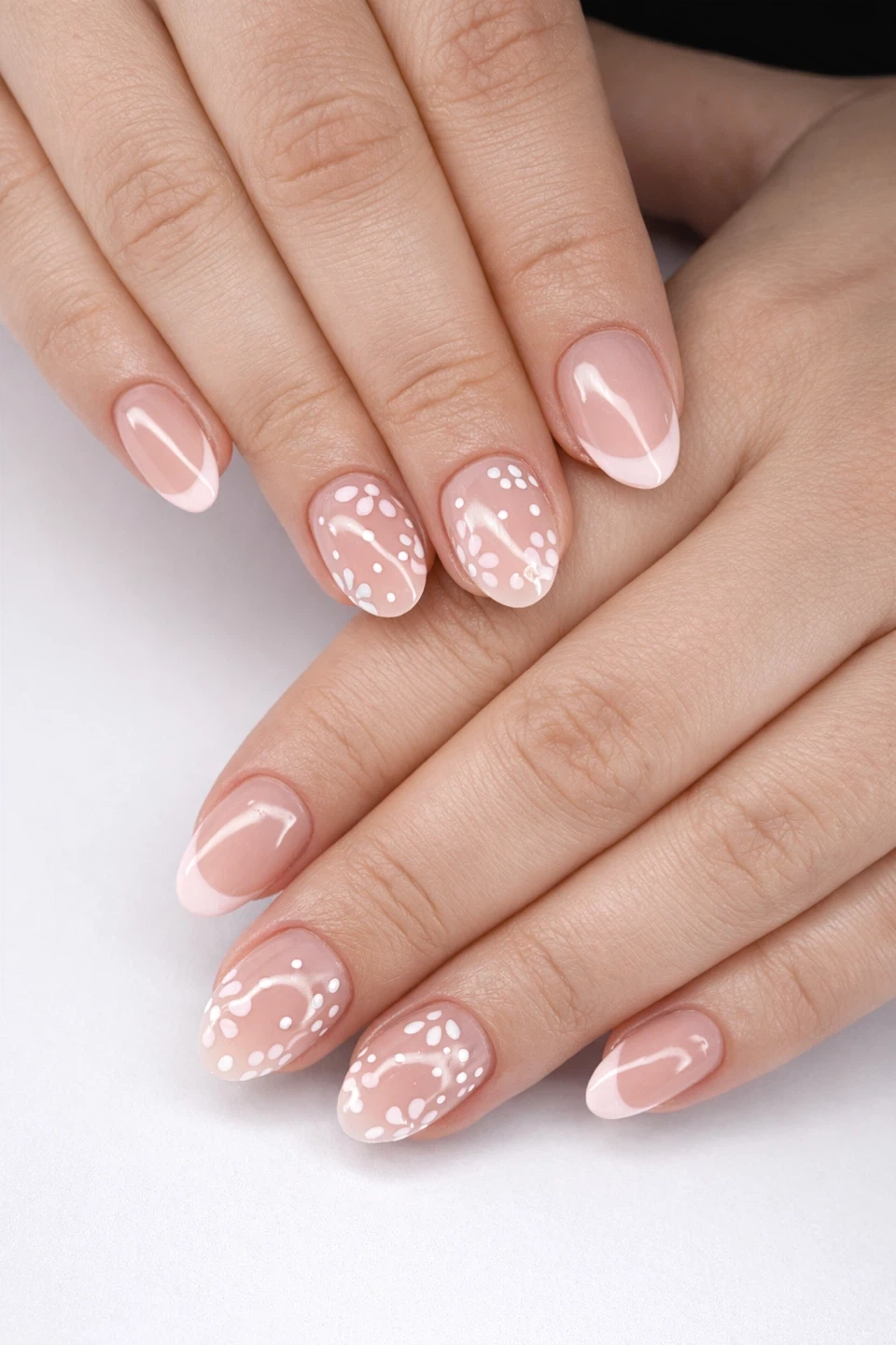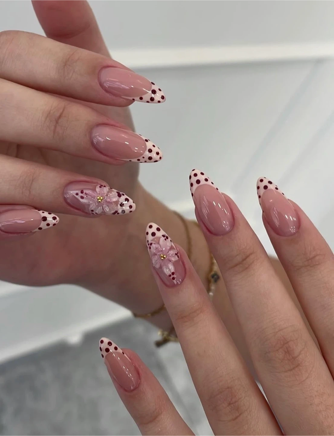 Acrylic nail designs including red metallic, floral, polka dot, and brown/gold abstract styles. Each set offers a unique look for your nails.