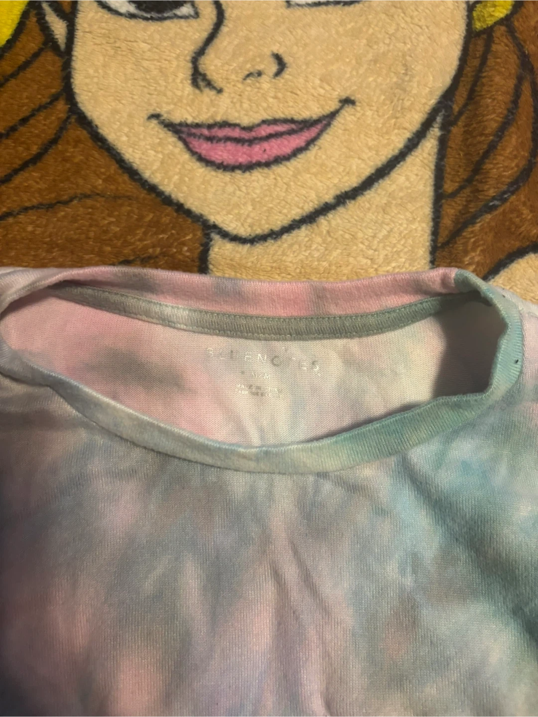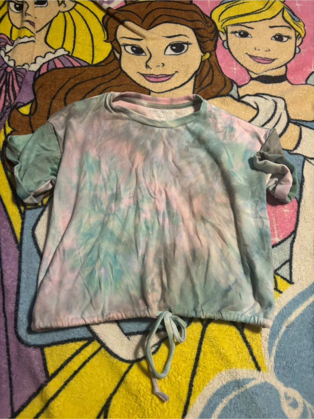 This tie-dye t-shirt features a pink, blue, and green pastel colour palette. It has a cropped hem with an adjustable drawstring. Perfect for casual wear!