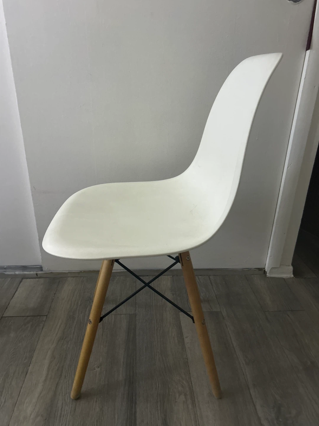 Selling a white Eames style dining chair. It's in great condition and would look great in any dining room or office space! The chair features a molded plastic seat and wooden legs.