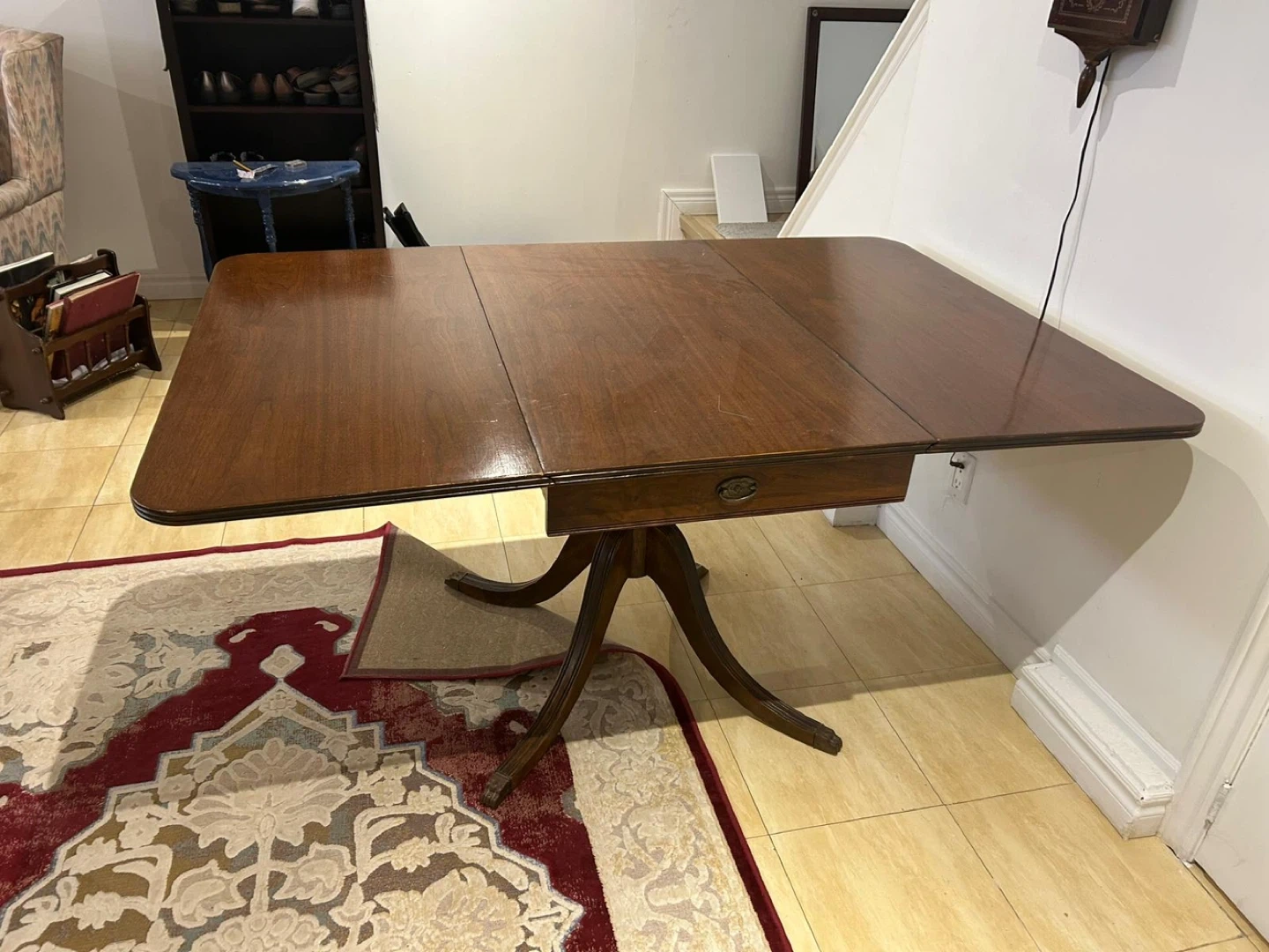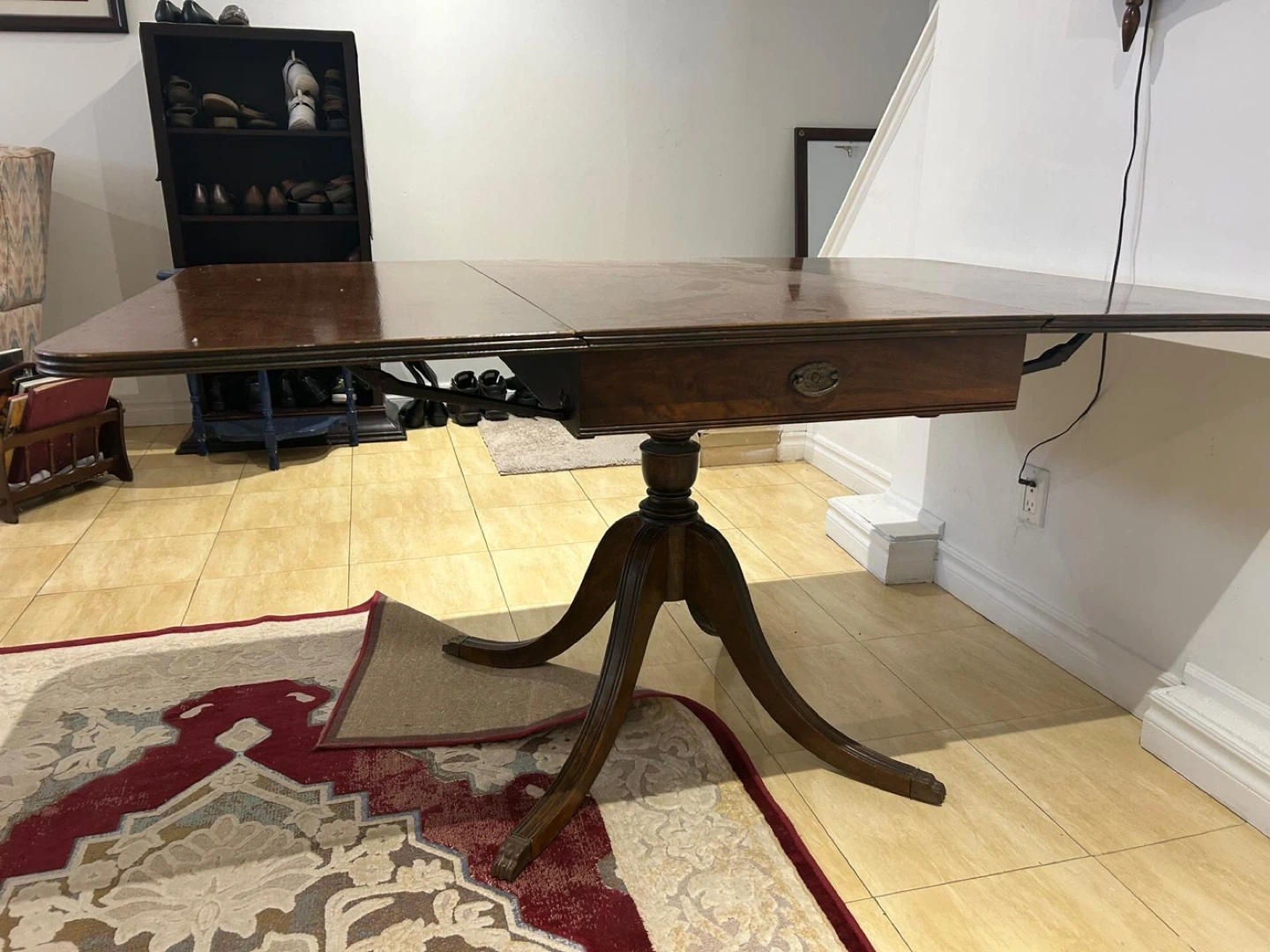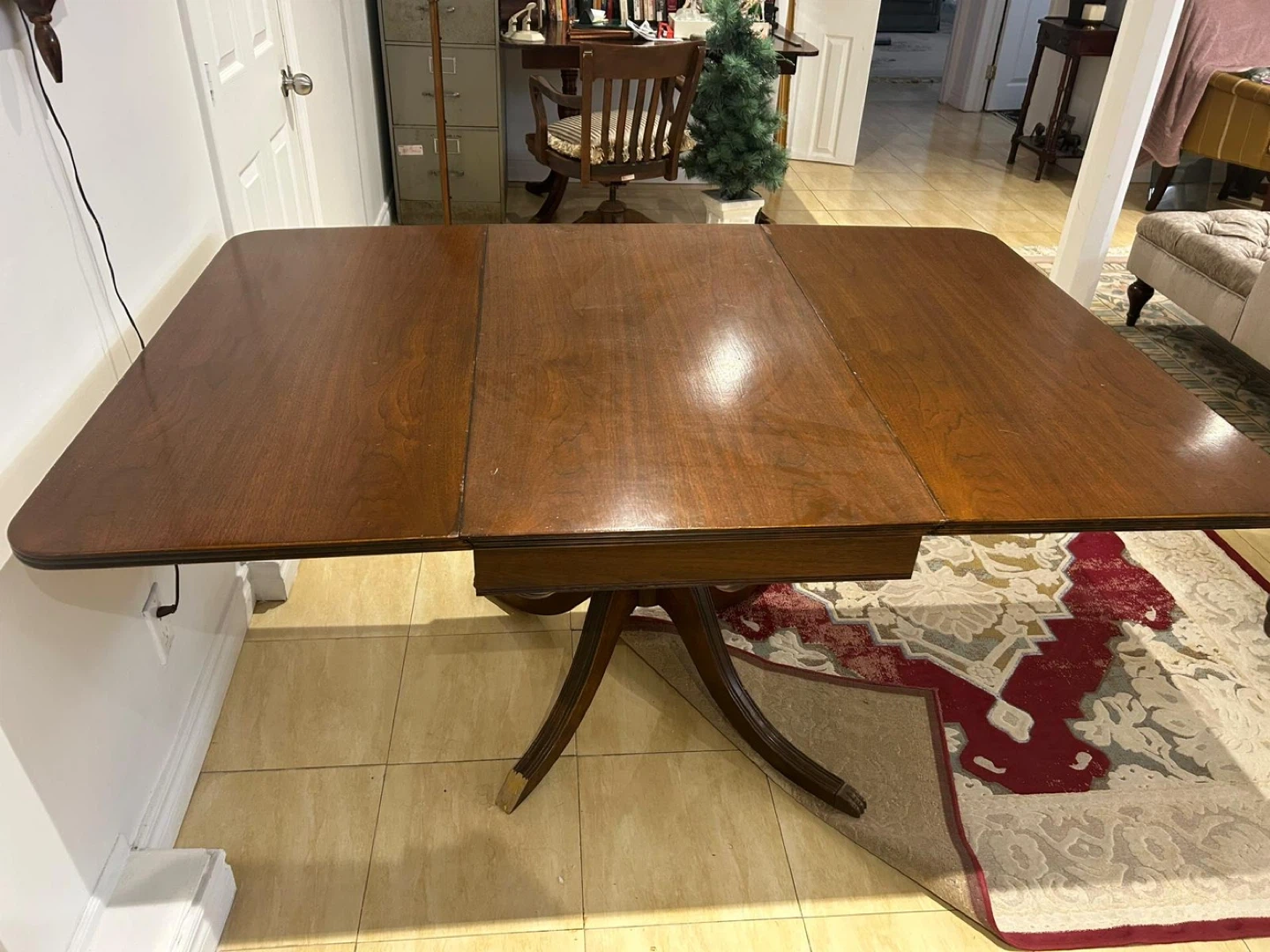 This is a classic dining table with a rich mahogany finish. It features drop leaves that can be folded down to save space. The table has a central pedestal base with curved legs and a single drawer.