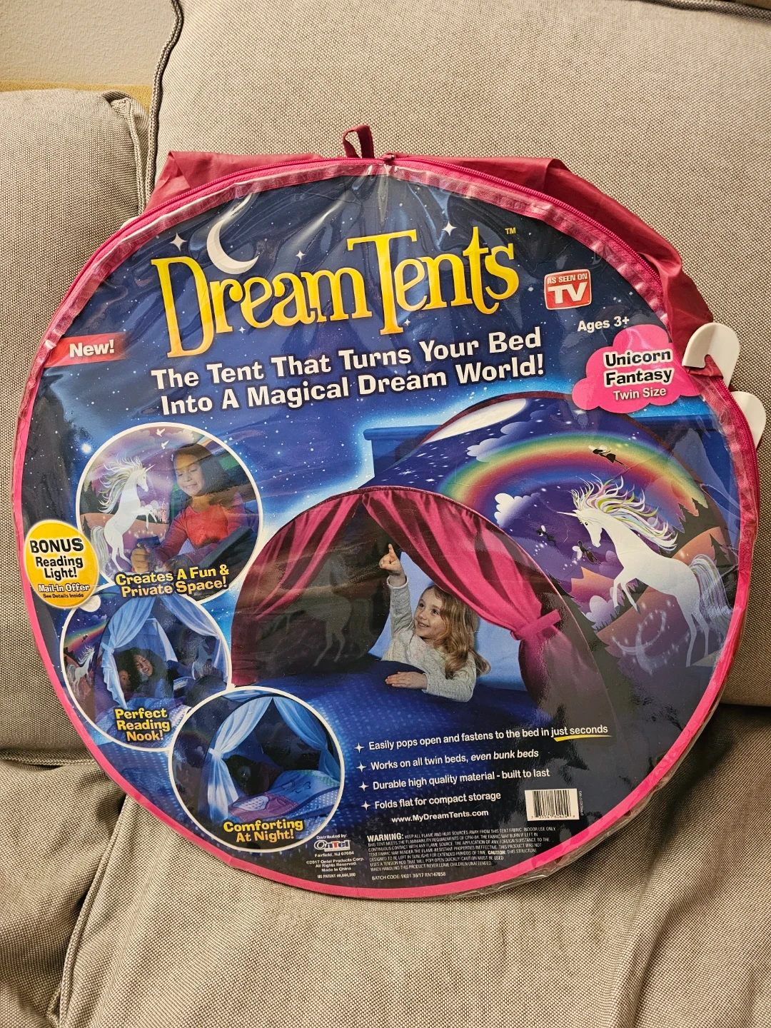Dream Tents transforms your bed into a magical dream world! It pops open and fastens to the bed in seconds. Works on all twin beds, even bunk beds, and folds flat for compact storage. Ages 3+.