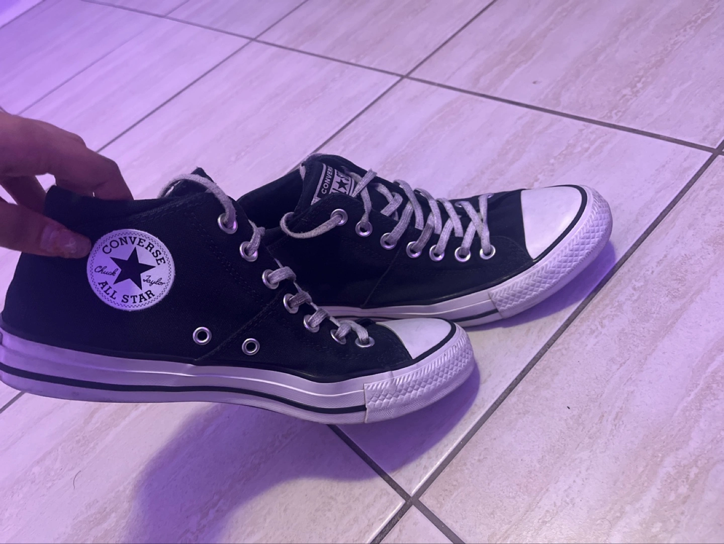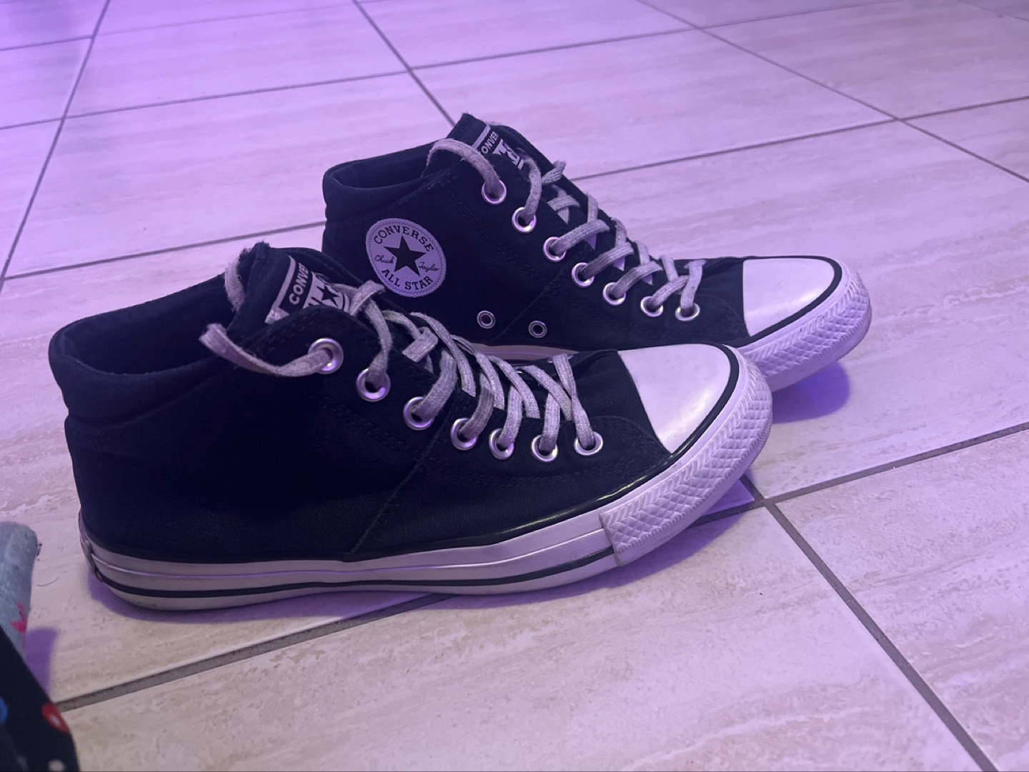 Black canvas Converse Chuck Taylor All Star mid-top sneakers. Grey laces. Pre-owned, good condition.