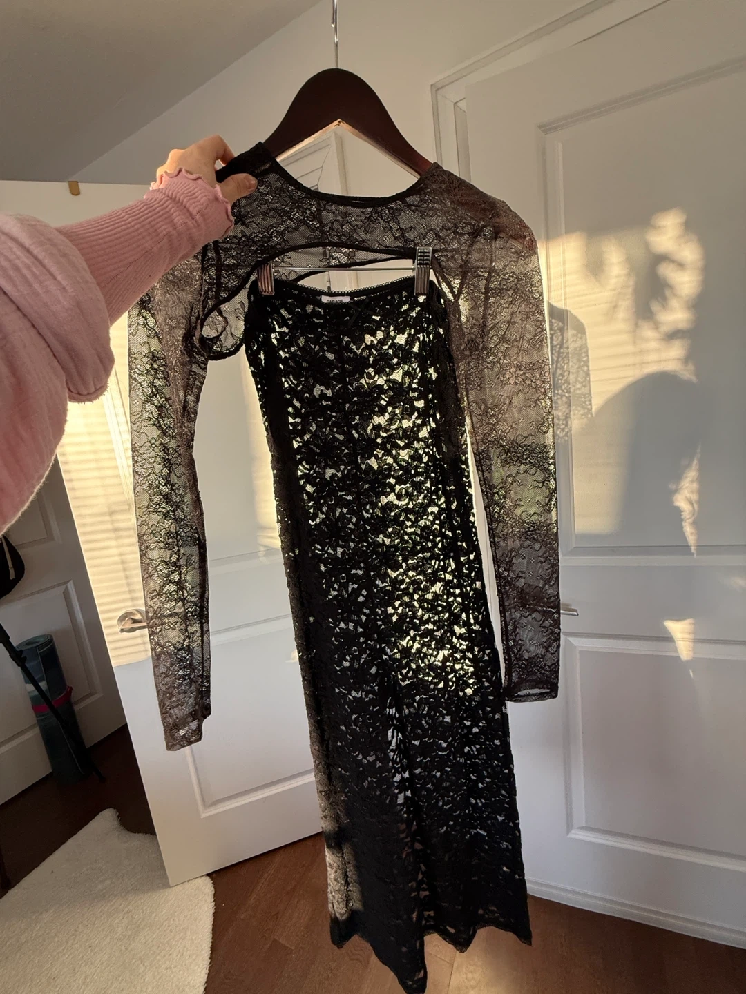 Black lace crop top + matching skirt + sleeves set. Everything is made of delicate lace material. Gorgeous & sexy💗
