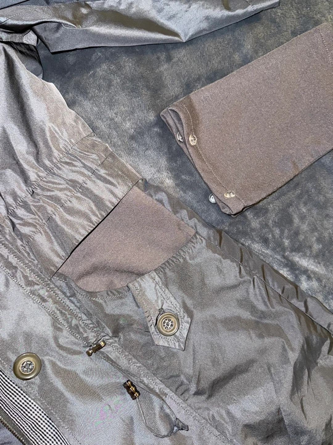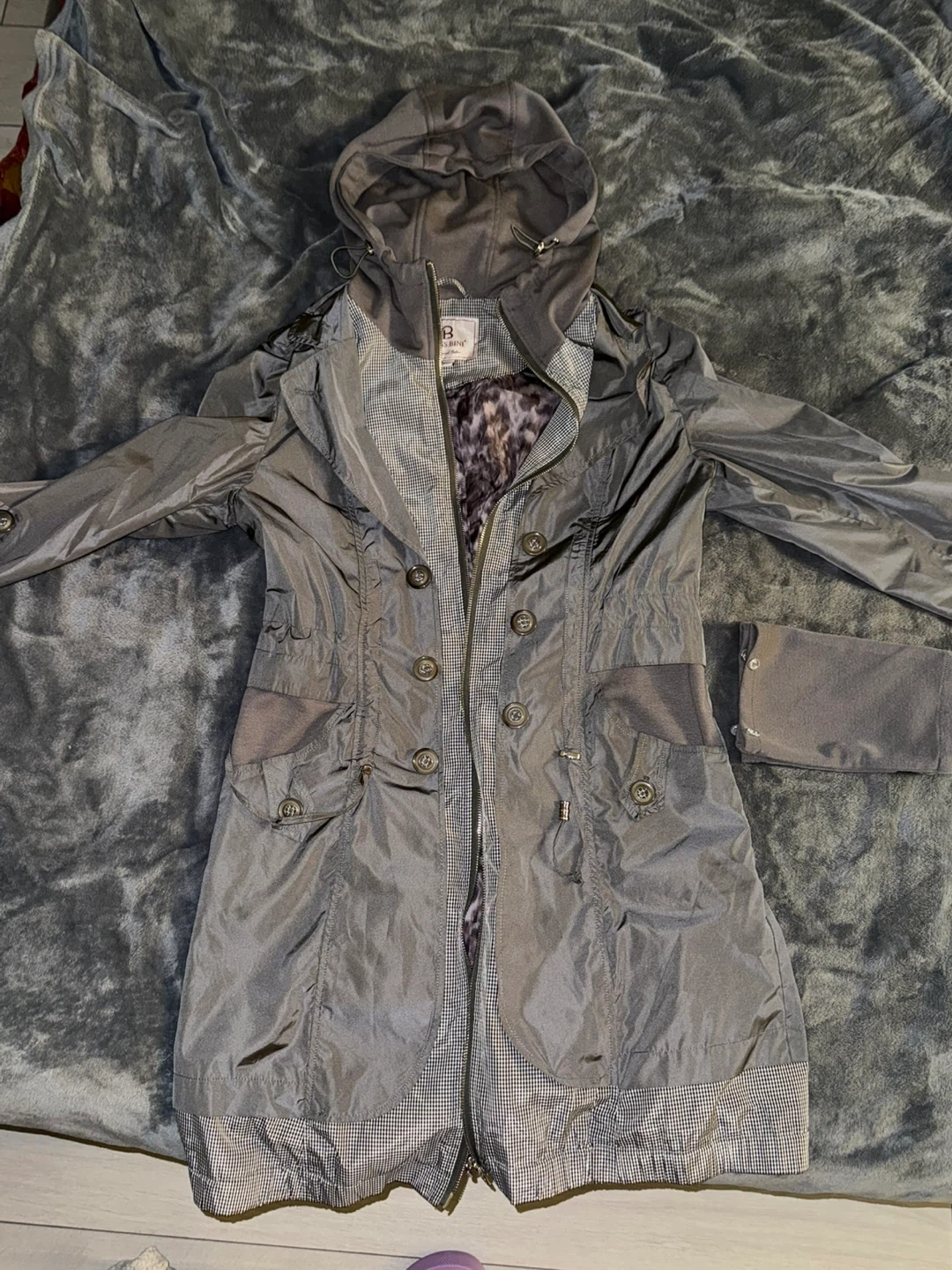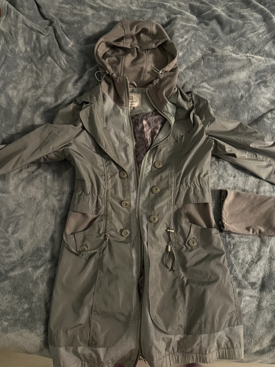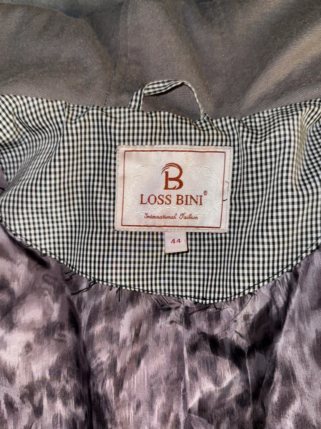 Here's a stylish trench coat from Loss Bini! It's a size 44 and features a unique design with a hood and button details