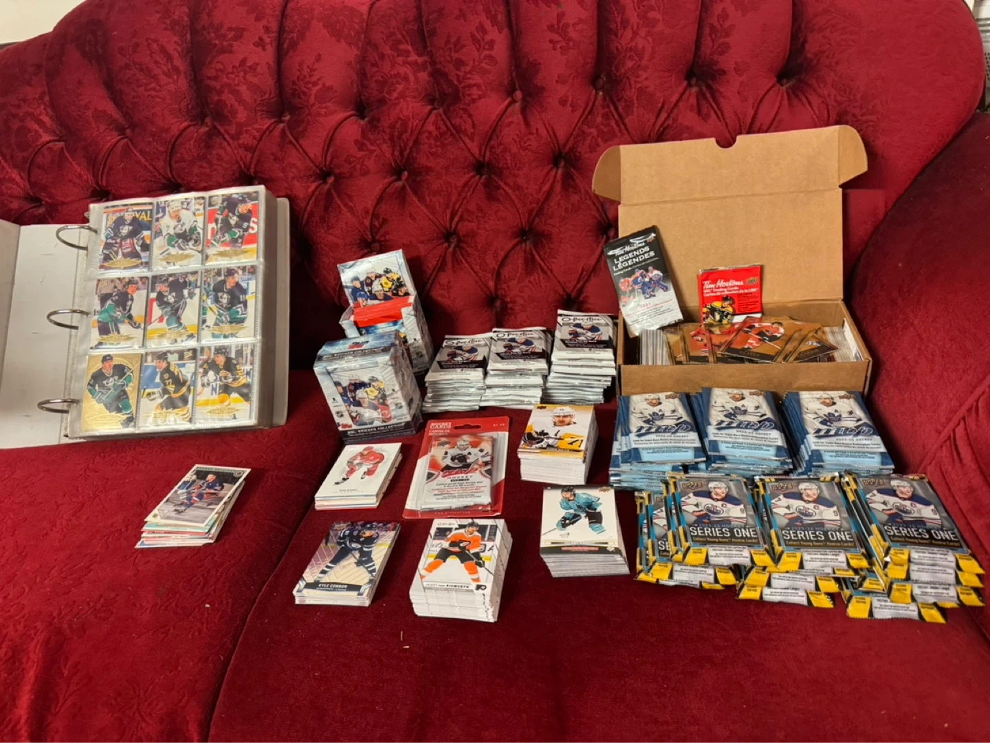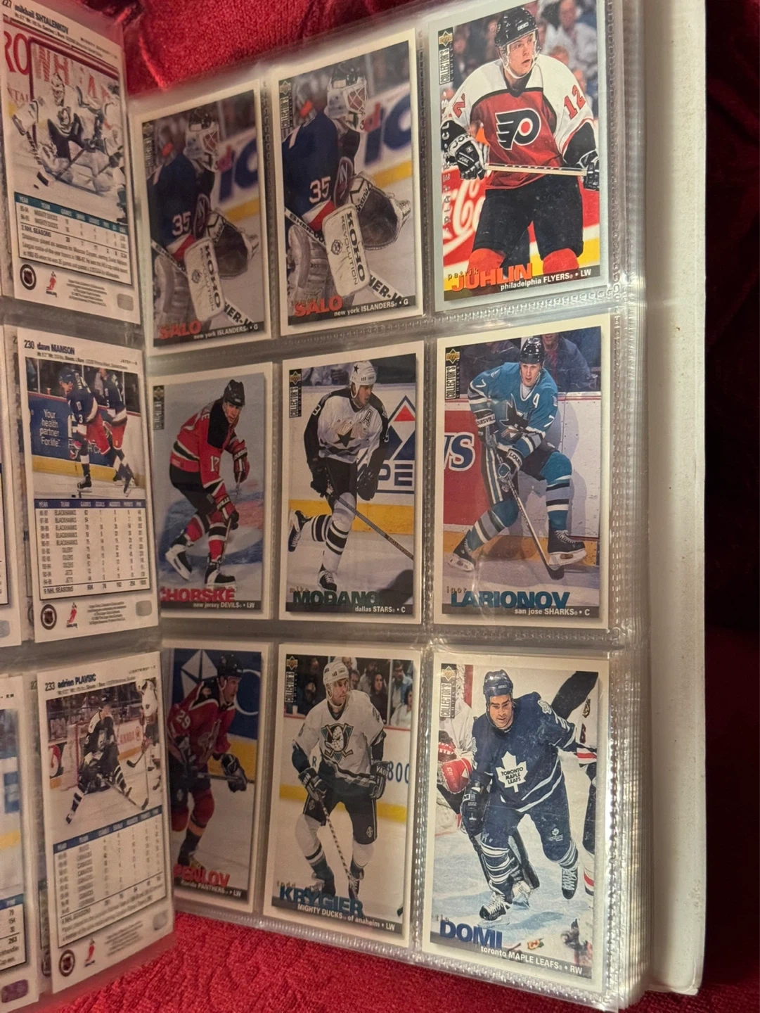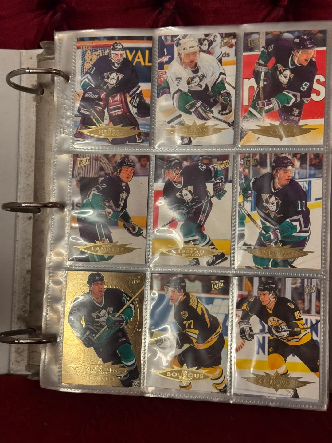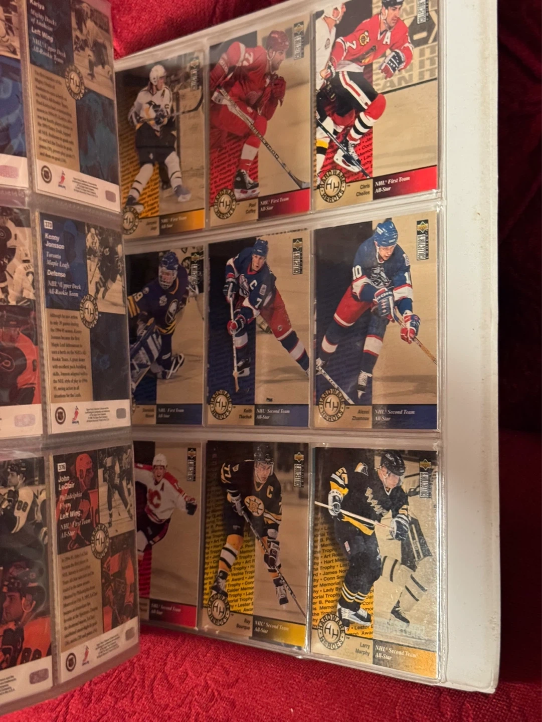 Binder full of hockey cards.