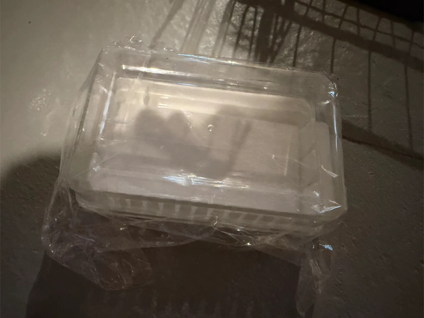 This is a clear plastic butter container with a lid. It's designed for food storage or transport. The container is rectangular and has a ribbed texture on the bottom.