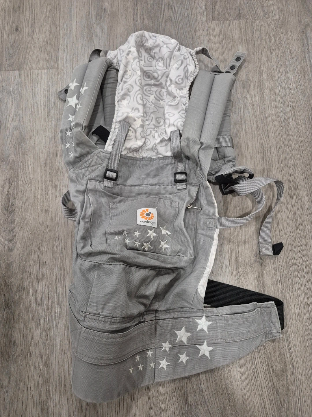 This Ergobaby carrier is grey with a white star pattern. It features adjustable straps for a comfortable fit. The padded shoulder straps and waist belt offer support. Useful for parents on the go!