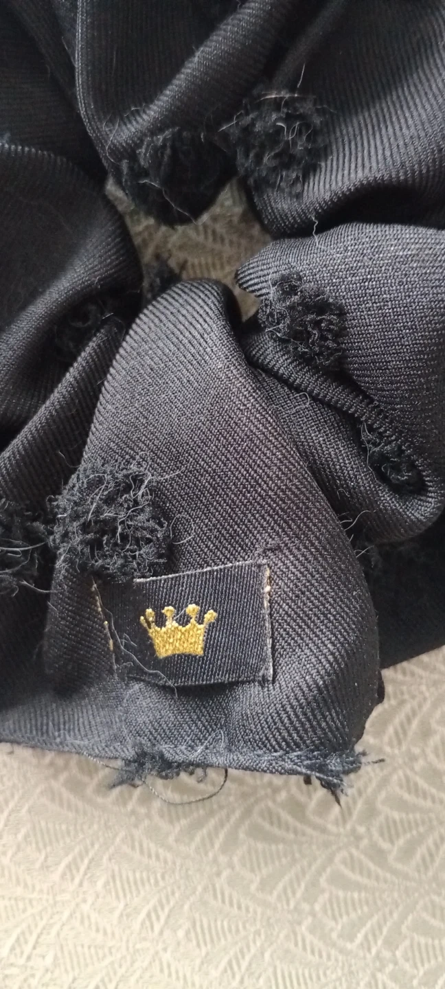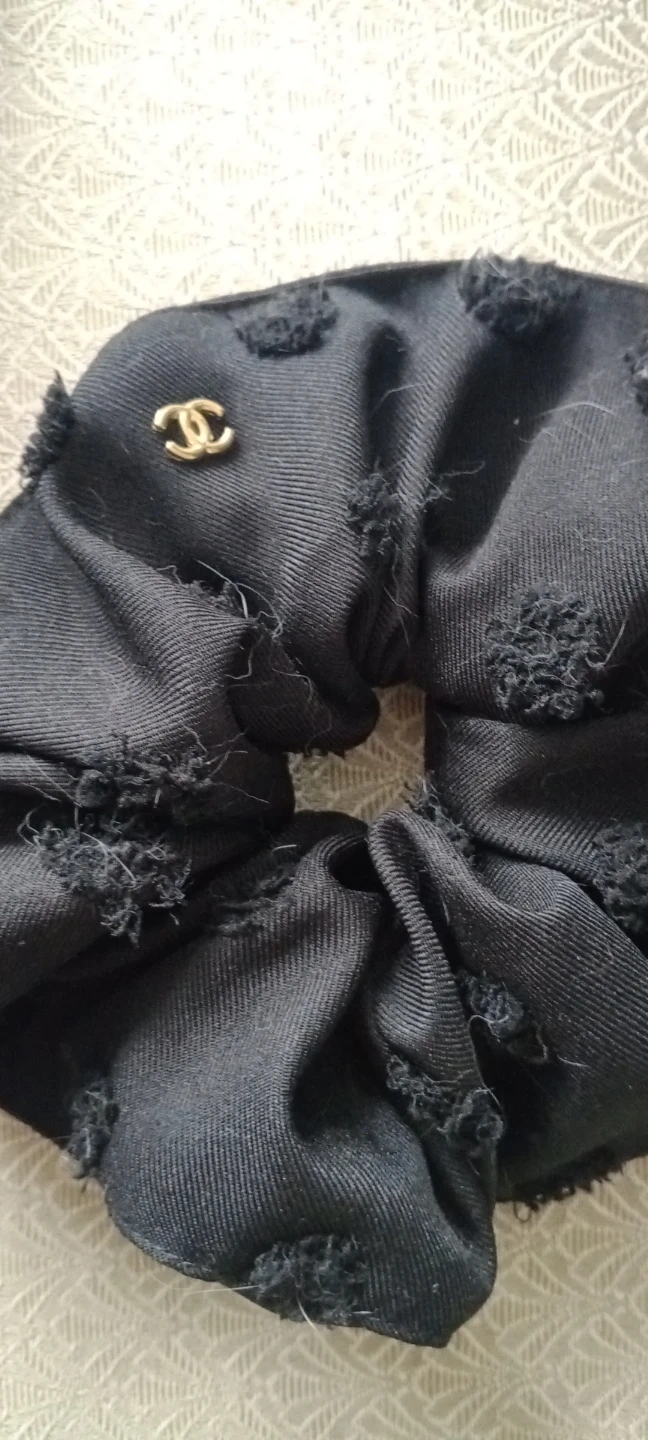This is a black scrunchie featuring a distressed texture with frayed details. It's adorned with a small gold-tone charm resembling the iconic CC logo. A small tag with a gold crown emblem is also attached.