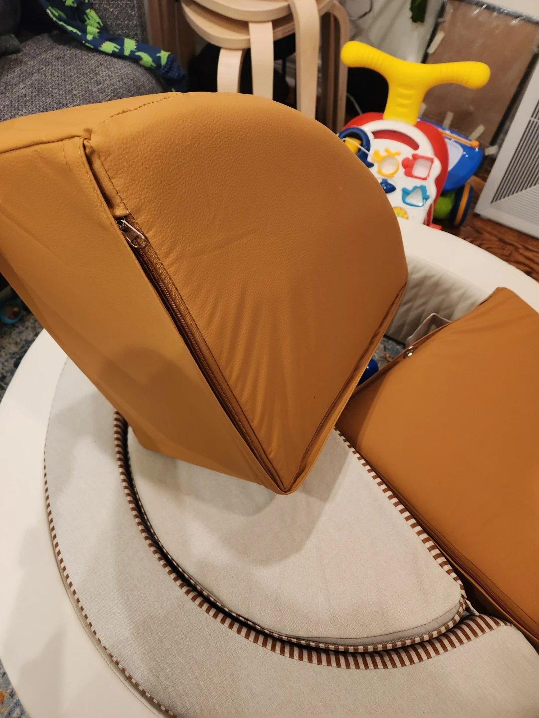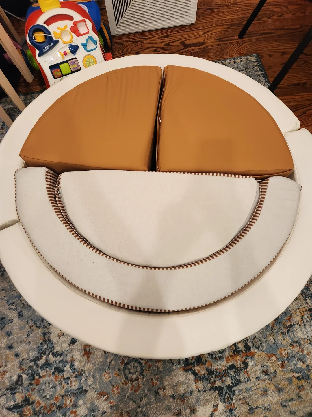 We purchased it last week, didn't realize this would be too big for our space unfortunately selling it. Baby has so far only used it for 2 days. It’s in brand new condition. No rips or stains. One of the triangle small blocks the zip doesn't close all the way through as shown in the picture. Balls are not included.