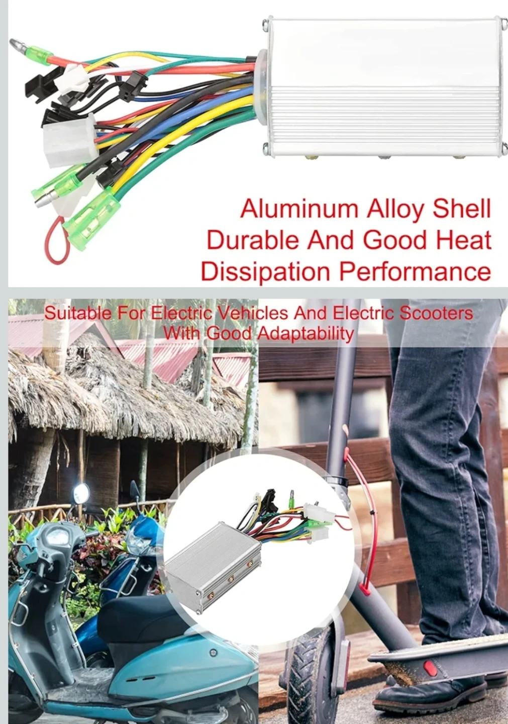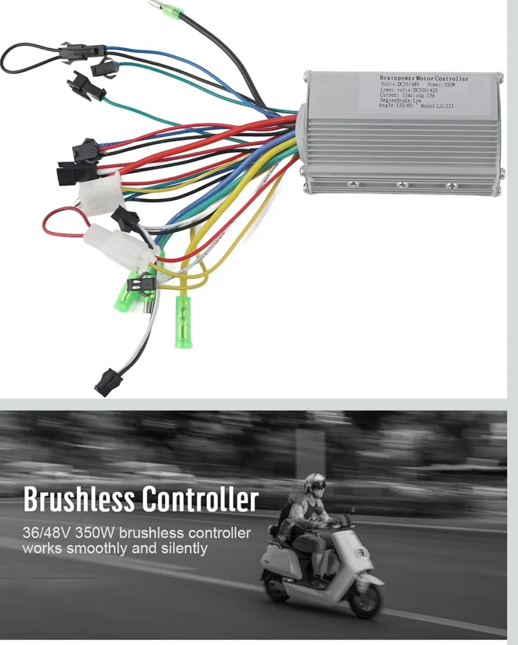This is a brushless motor controller designed for 36/48V systems with a 350W power rating. It features an aluminum alloy shell for good heat dissipation. Dimensions are 9cm x 5.3cm x 3cm.