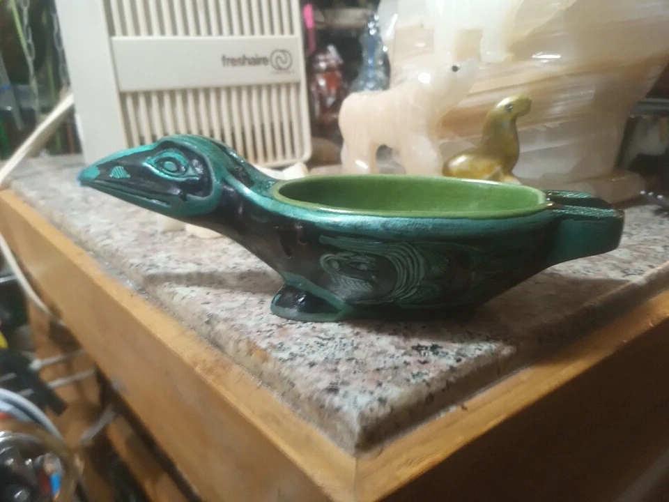 Unique ceramic ashtray with a detailed animal design in green and black. It's a functional piece with an artistic flair. Perfect for a collector or as a unique decor item!