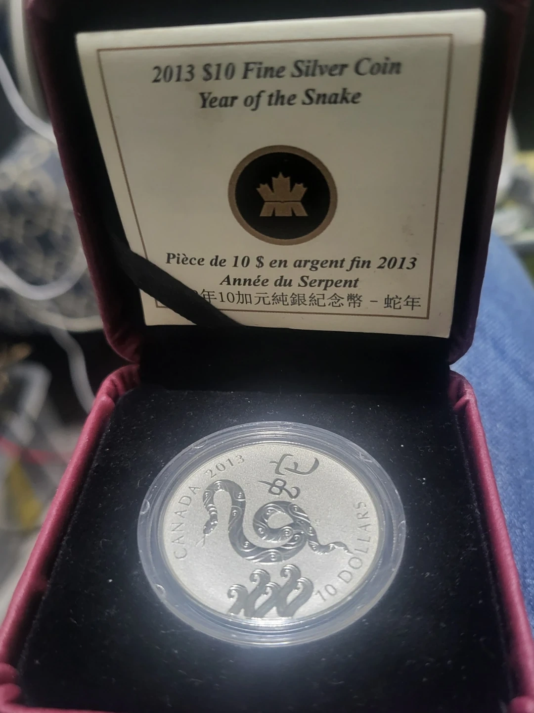 This is a 2013 $10 fine silver coin from Canada, featuring the Year of the Snake design. It's presented in a protective case with accompanying documentation. The coin is made of fine silver and has a face value of $10.
