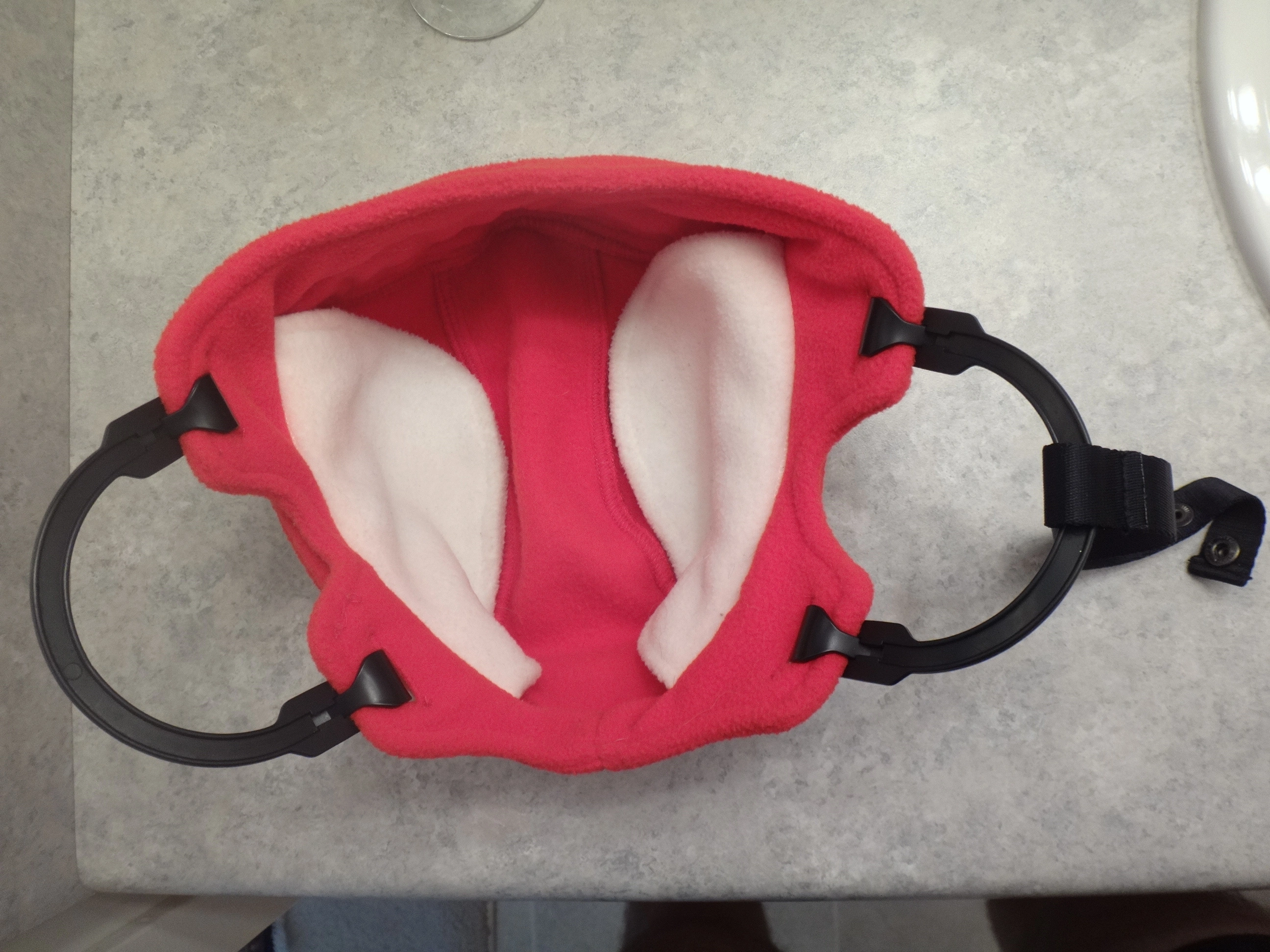 It has white ear warmers that can fold up or down and you can remove the rubber ear rings and strap. just washed so it's clean and ready for it's next owner.