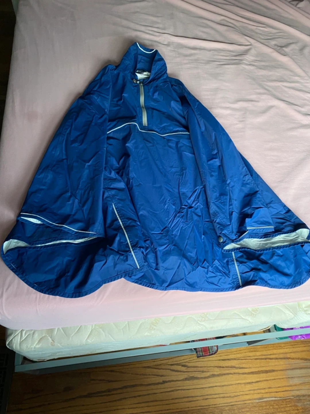 A blue rain poncho from Mountain Equipment Co-op. Size is XL. Lightweight and packable for on-the-go protection from the rain! Almost new!