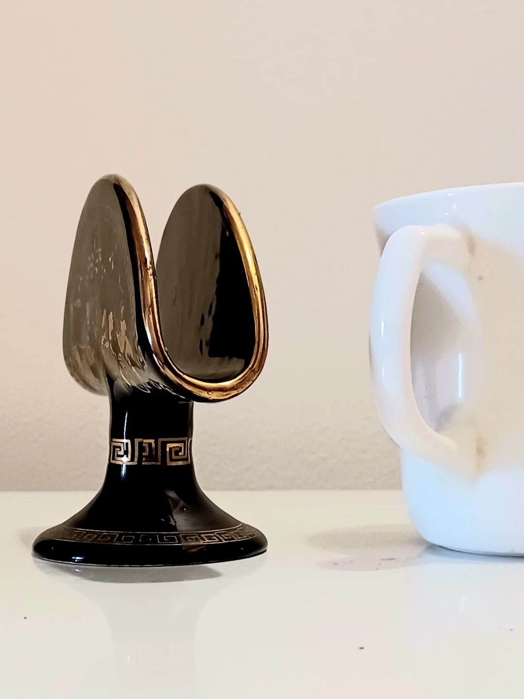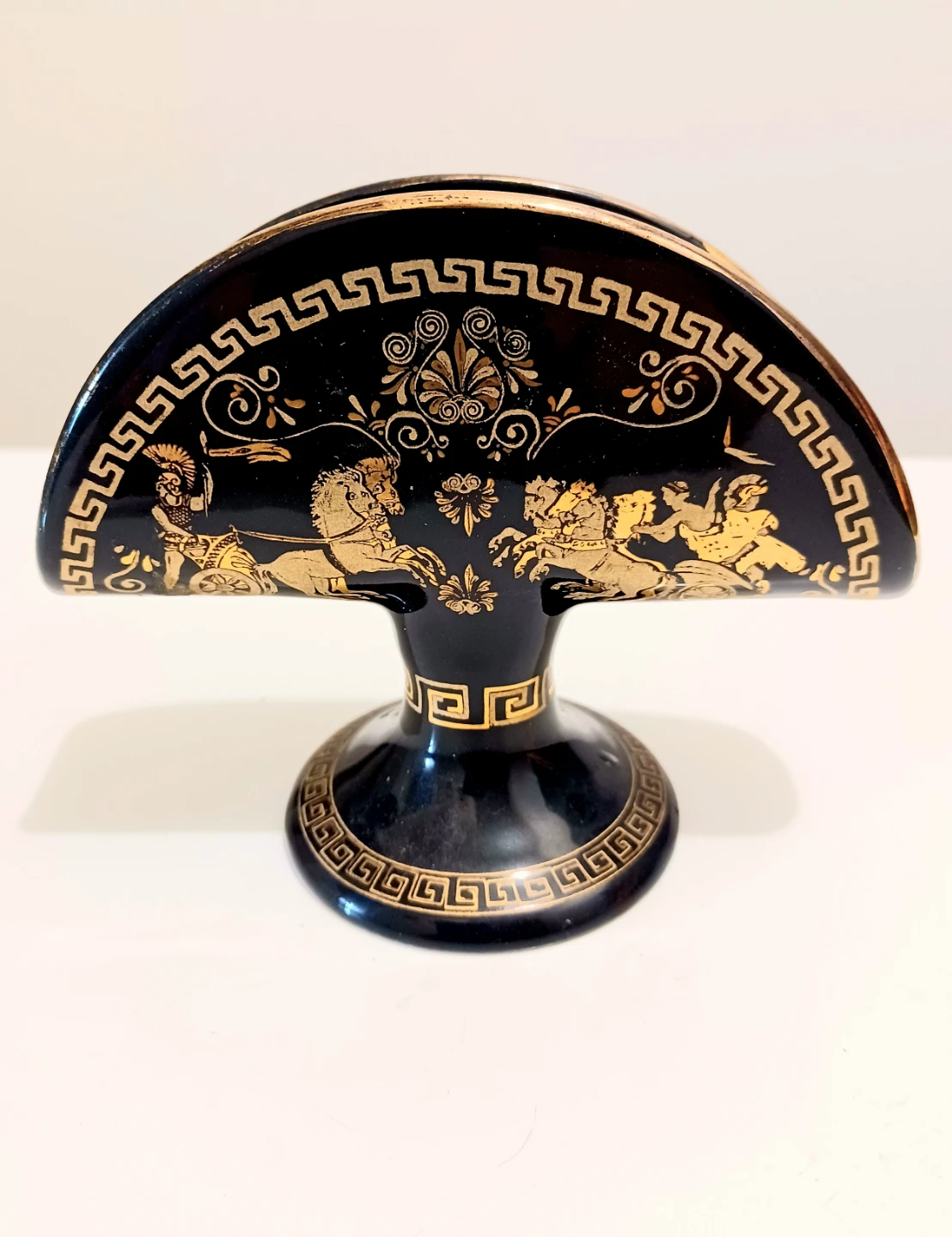 Vintage 1960s, Porcelain napkin or letter holder Handmade in Greece, featuring Glazed ,Meticulously Hand-painted 24k Gold Mythological scenes and a traditional Greek key pattern.