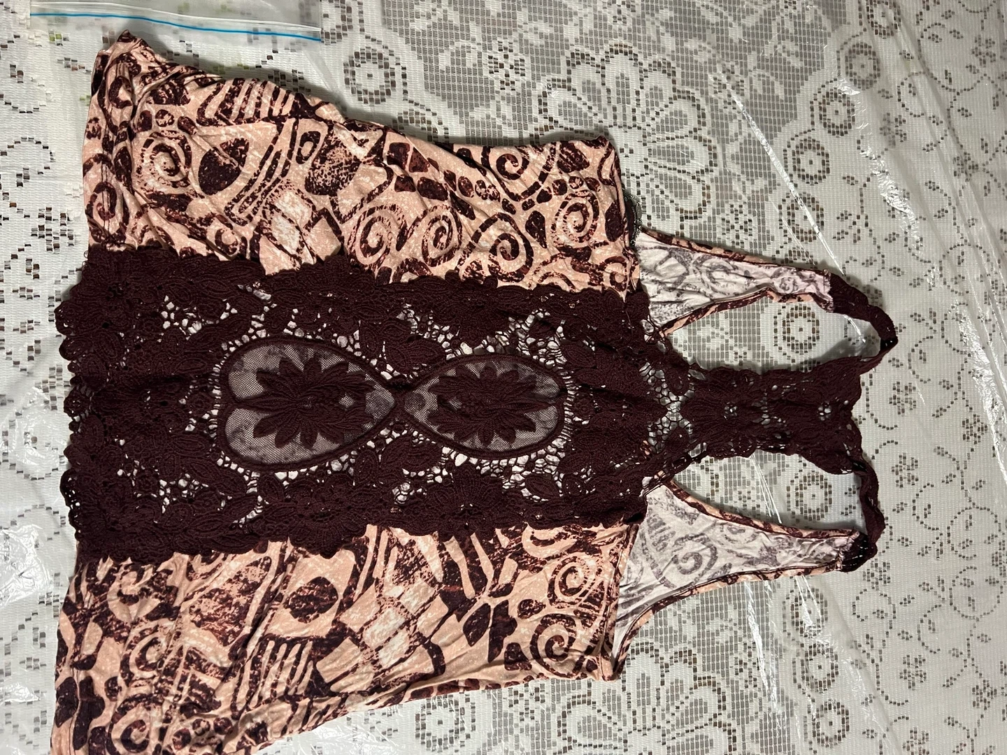 Selling a cute tank top in a mix of brown and pink tones! It features a unique pattern and a lace detail on the front.