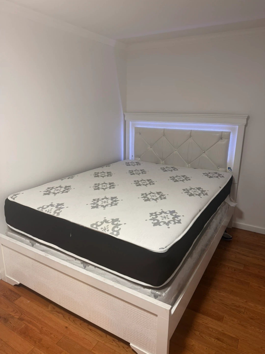This is a queen-size mattress with a decorative gray and white pattern. It features a dark gray border and a quilted top. It's about 8-10 inches thick. It's suitable for a queen bed frame. It's like this as seen in the photo the whole game