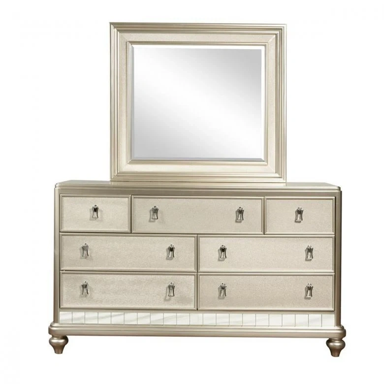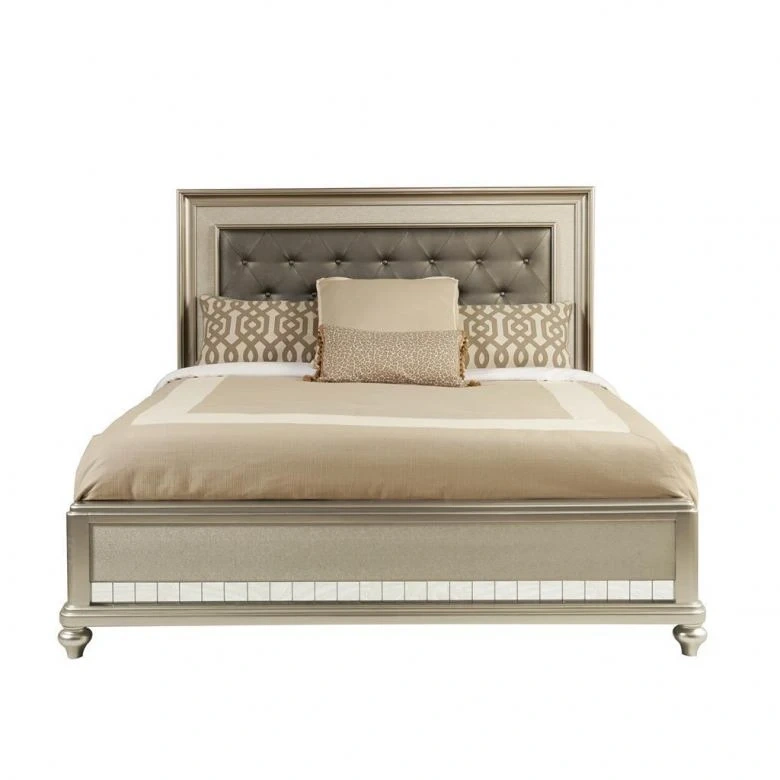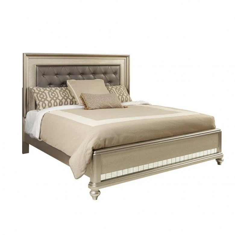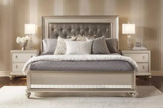 Spruce up your bedroom with this beautiful, gently loved queen bed frame set, complete with a dresser and two nightstands, all featuring an elegant champagne finish and mirrored trim! As a set that has been previously enjoyed, each piece carries a unique charm and is ready to transform your bedroom into a stylish sanctuary.