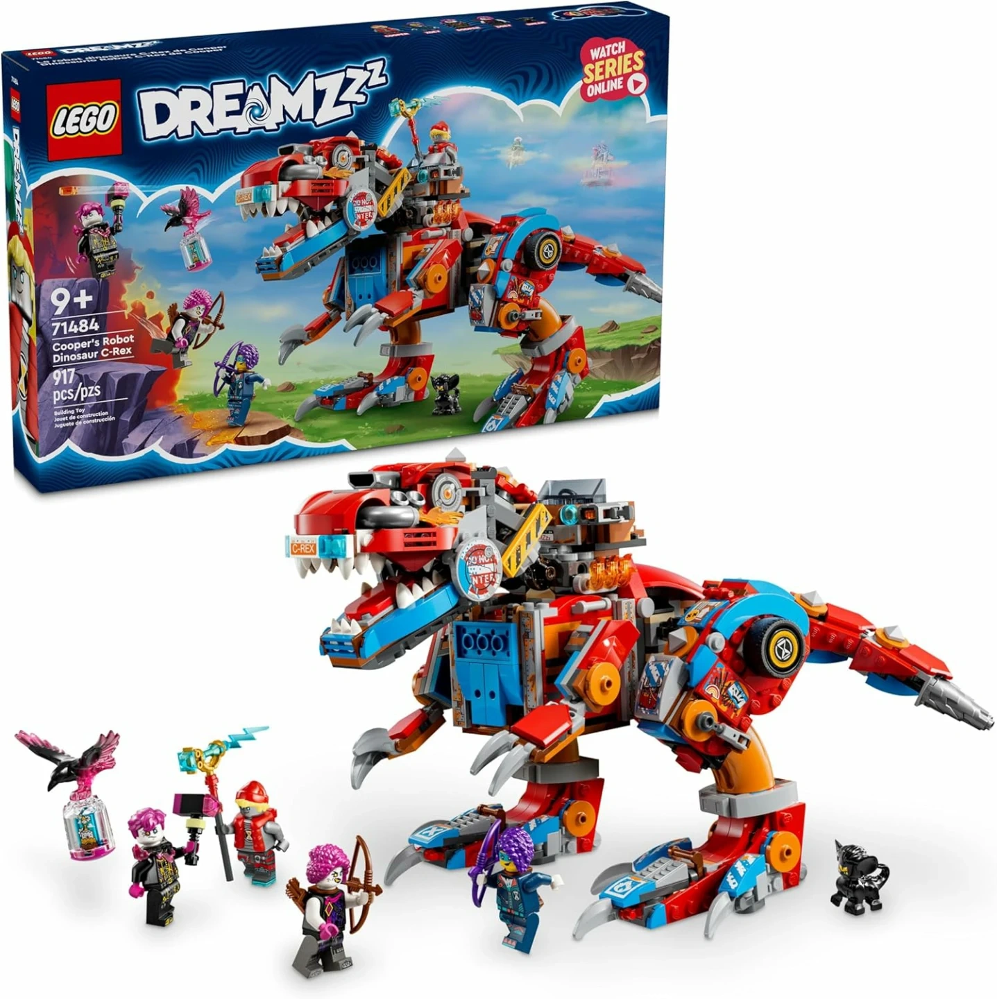 This is the LEGO DREAMZzz Cooper's Robot Dinosaur C-Rex set, number 71484. It includes 917 pieces and is recommended for ages 9 and up. It comes with minifigures and accessories for building and play.