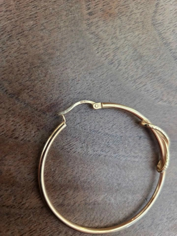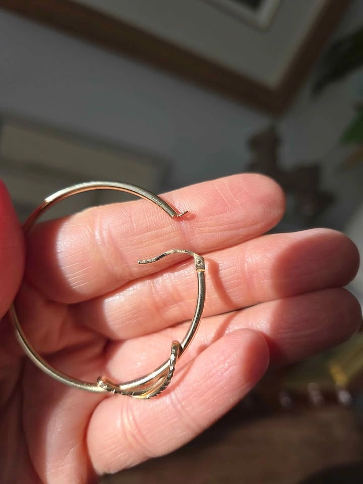 Absolutely gorgeous large hoop earrings with a solid clasp that stays shut. These are 14 karat filled gold which means they are very beautiful and will last a long time.