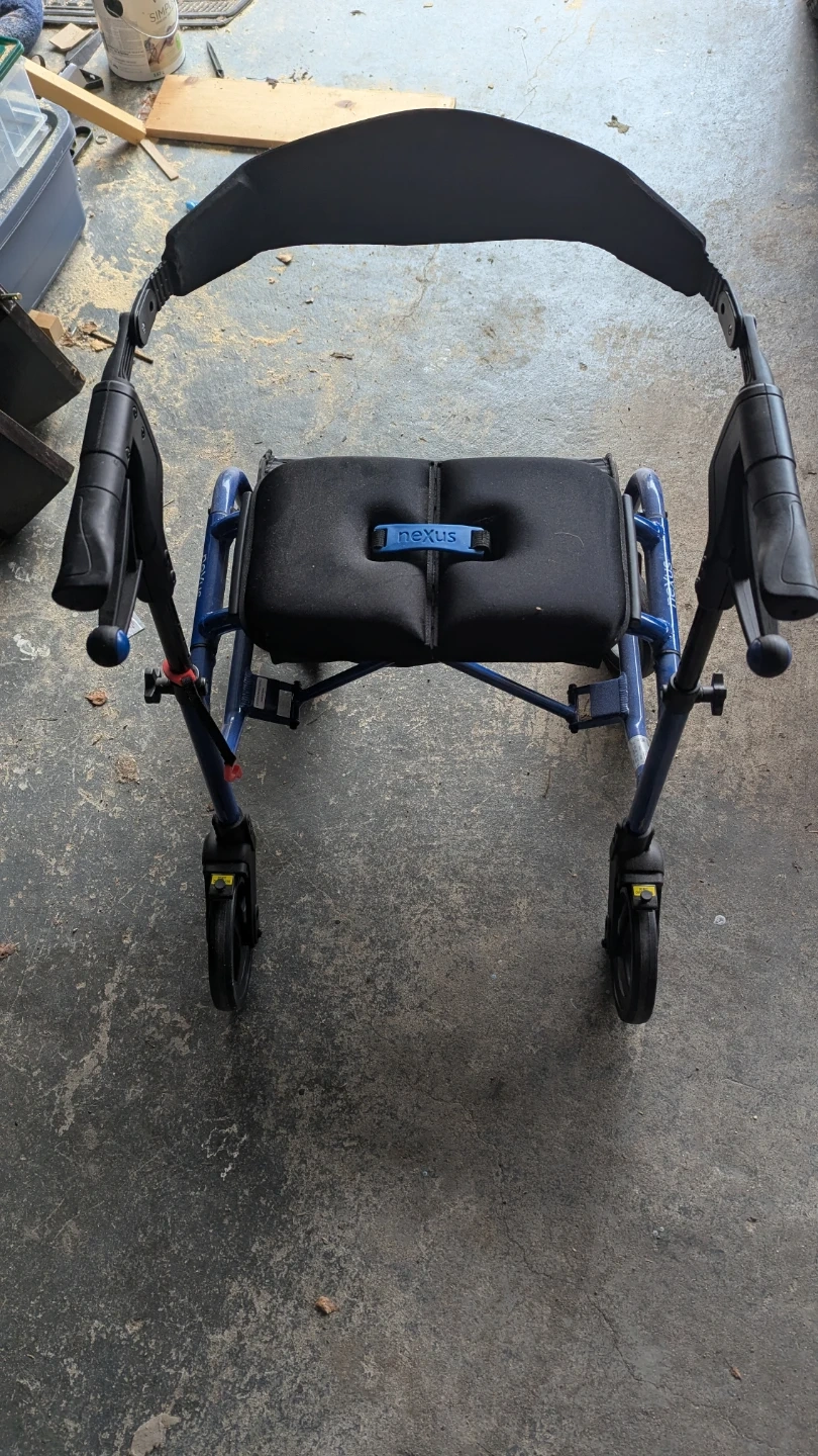 Nexus walker rollator in a vibrant blue. It features a comfortable seat and a handy storage basket underneath. Great for mobility assistance!