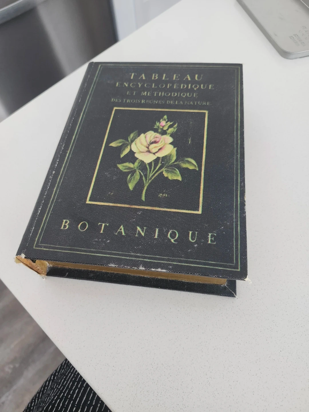 This decorative box is designed to look like a vintage book with a "Botanique" cover and floral illustration. It opens to reveal a lined interior for storing small items. It's a lovely piece for display on a shelf or desk.