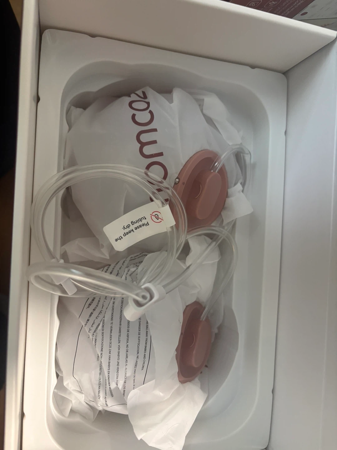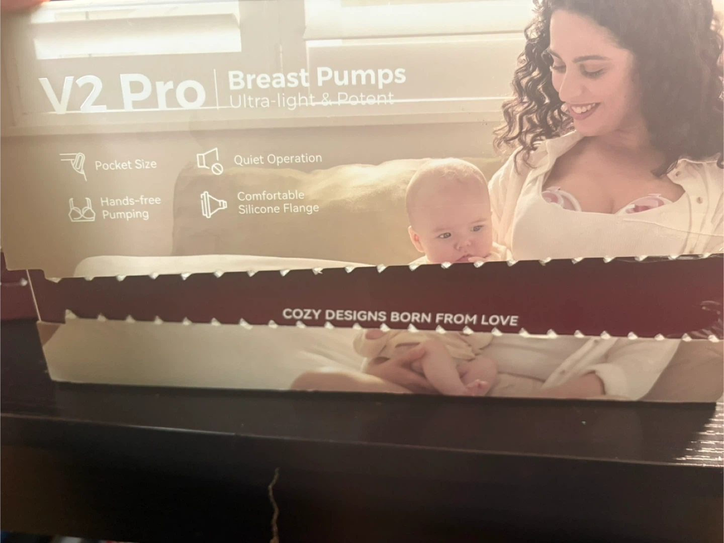 Momcozy V2 Pro breast pump. Ultra-light and potent design with quiet operation. Features a comfortable silicone flange and hands-free pumping capability. Includes original box and all accessories.