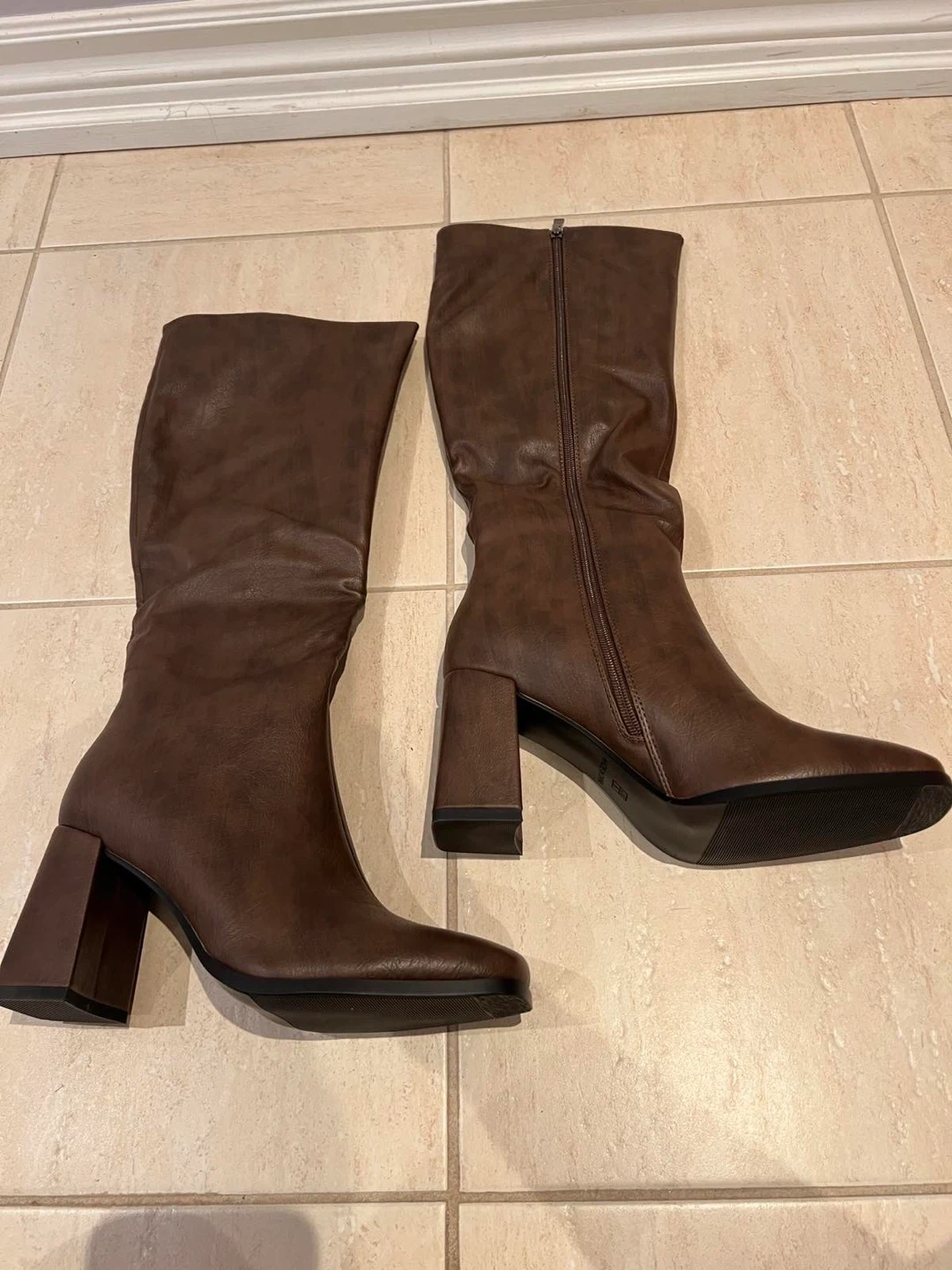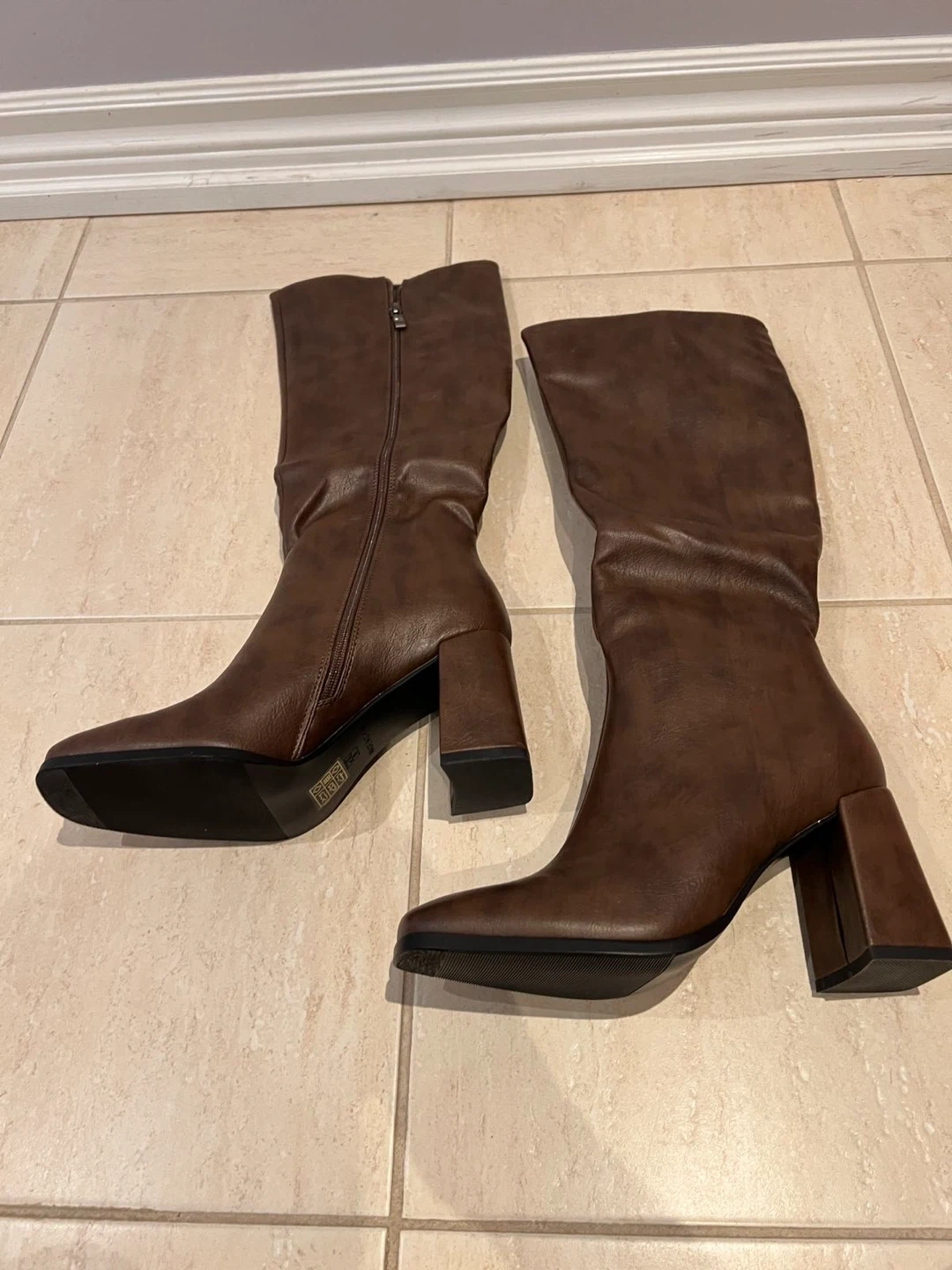 These stylish brown knee-high boots feature a faux leather finish and a comfortable block heel. They zip up the side for easy wear. The square toe adds a modern touch.