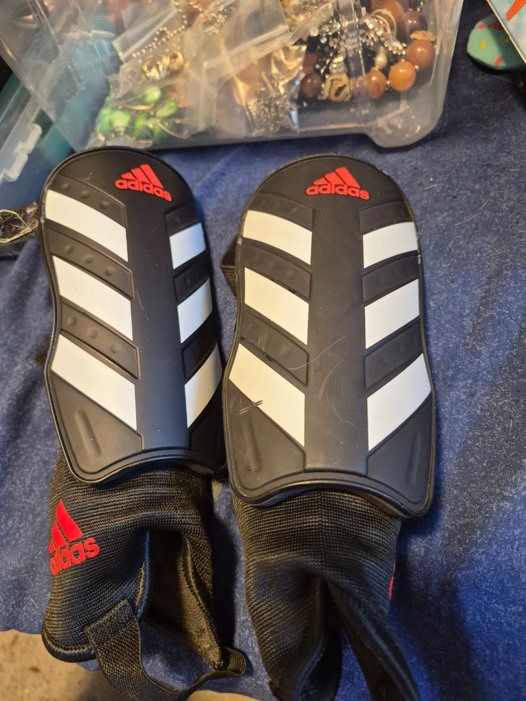 These are a pair of Adidas soccer shin guards. They're made with a durable outer shell and a soft inner lining for comfort. Straps ensure a snug fit during plaster l