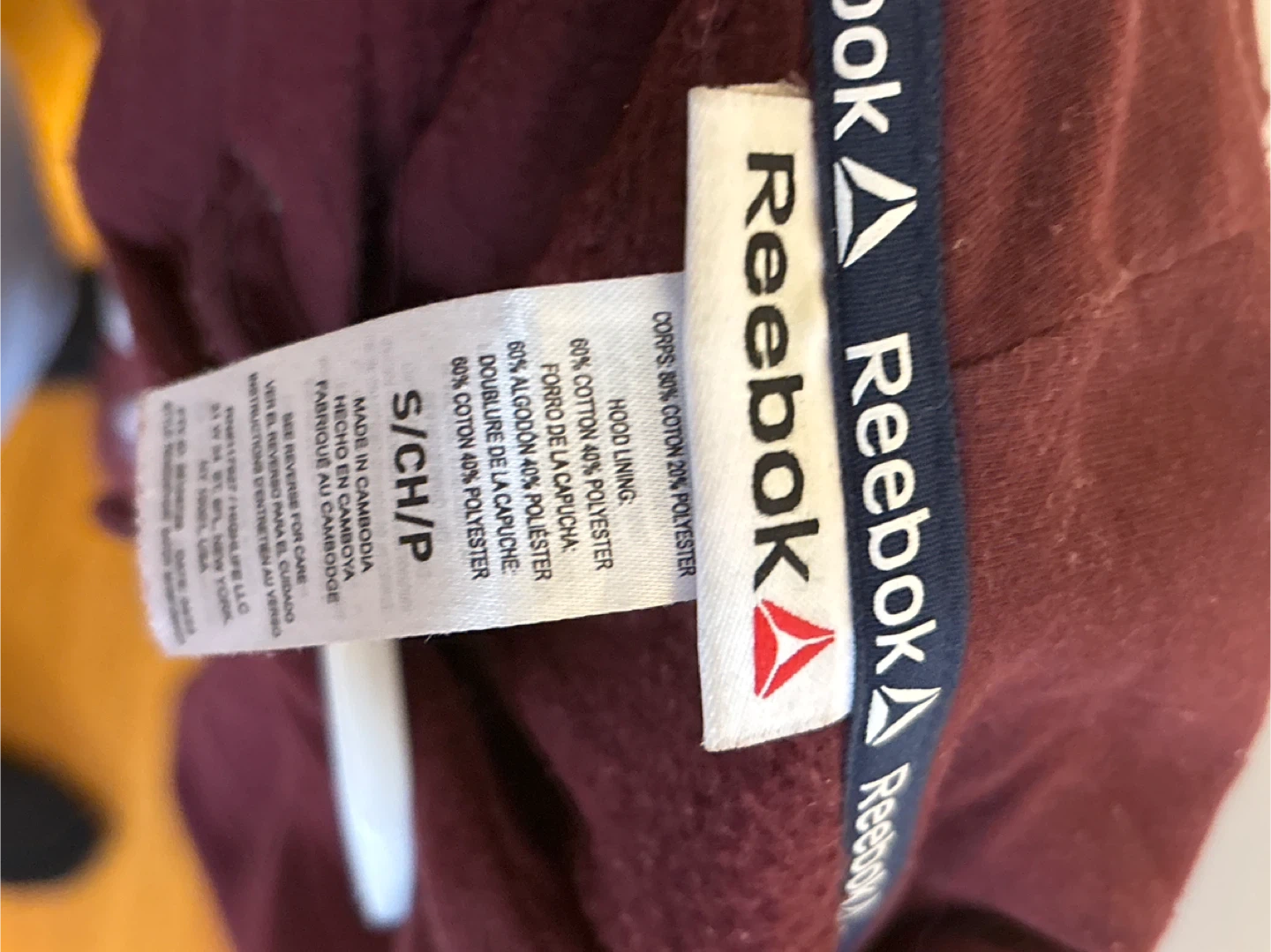 This is a Reebok burgundy hooded sweatshirt. It's made with 60% cotton and 40% polyester for the hood lining. The outer shell is 60% cotton and 40% polyester. It features a front kangaroo pocket.