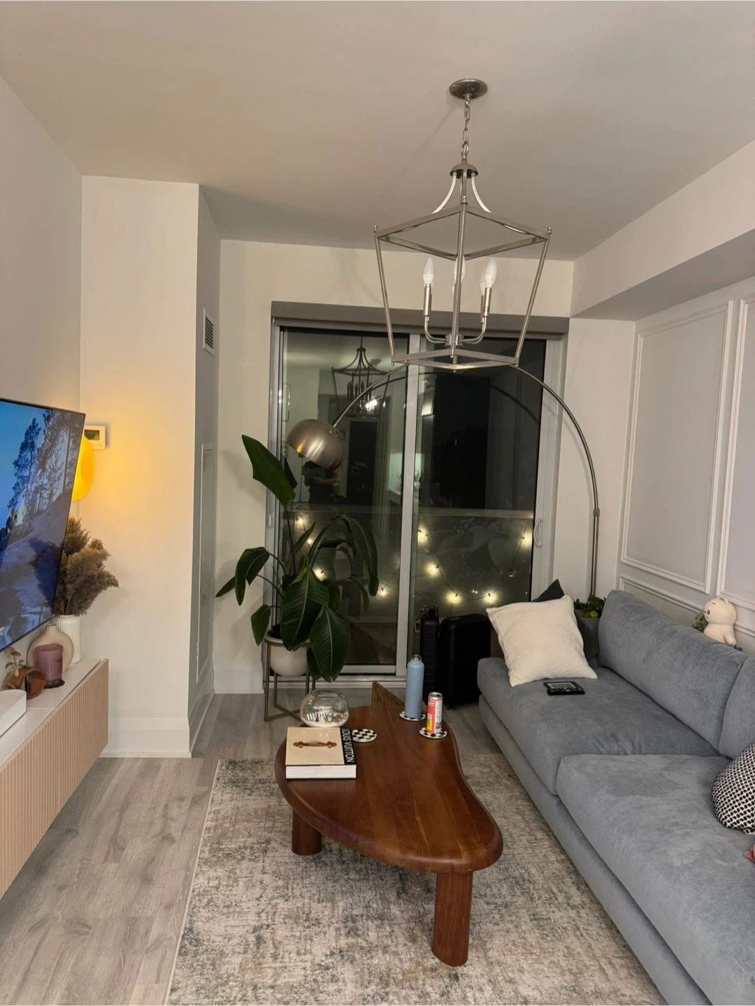 I wish I took a better picture before I swapped it but this stylish lantern-style chandelier brings a modern touch to any room. It features a brushed nickel finish and clear glass panels.
