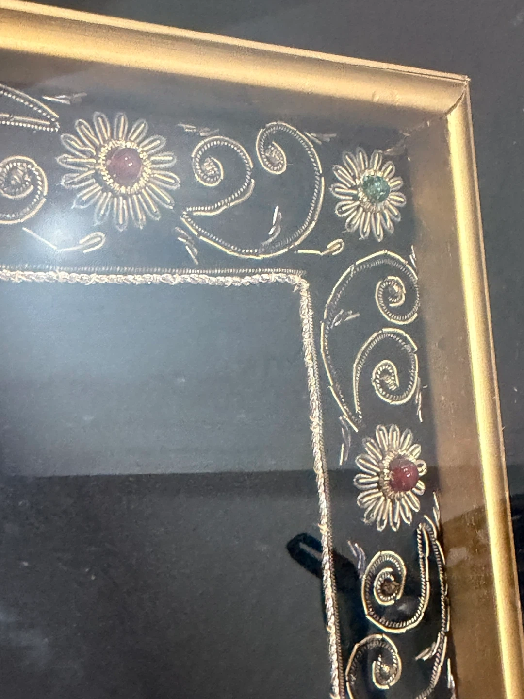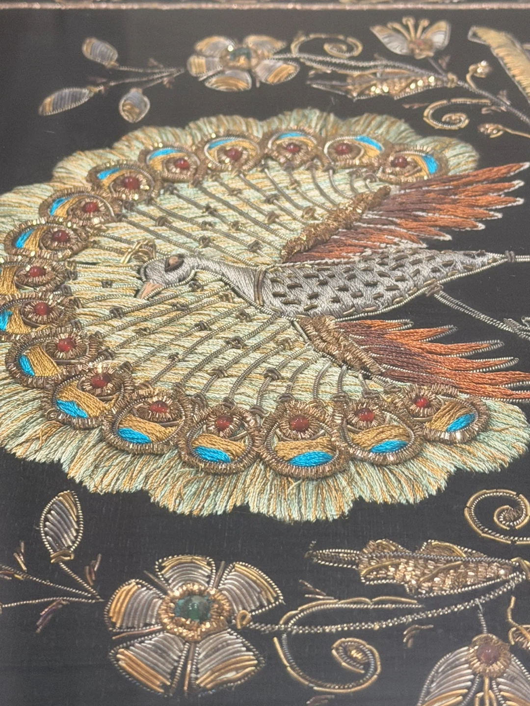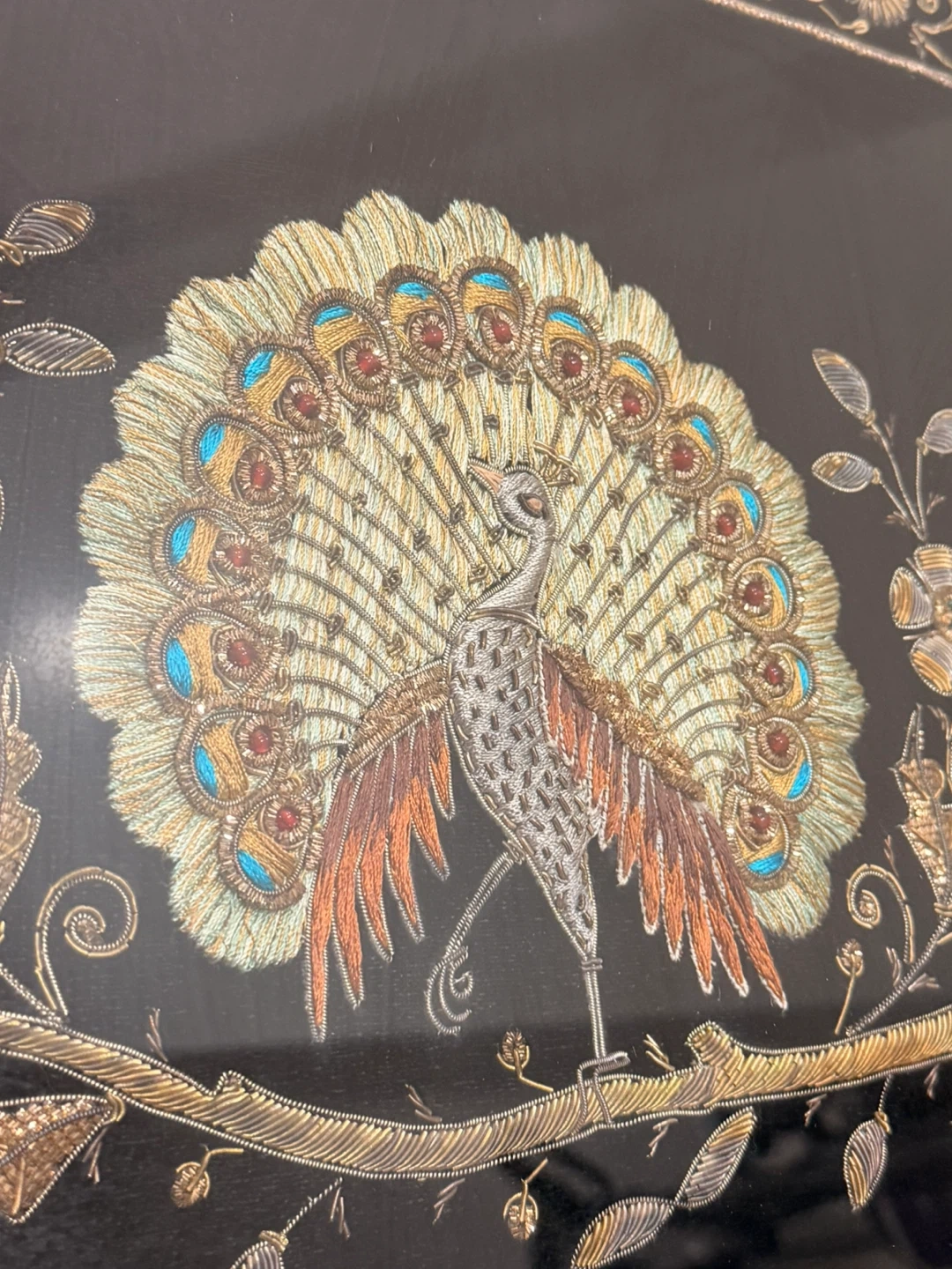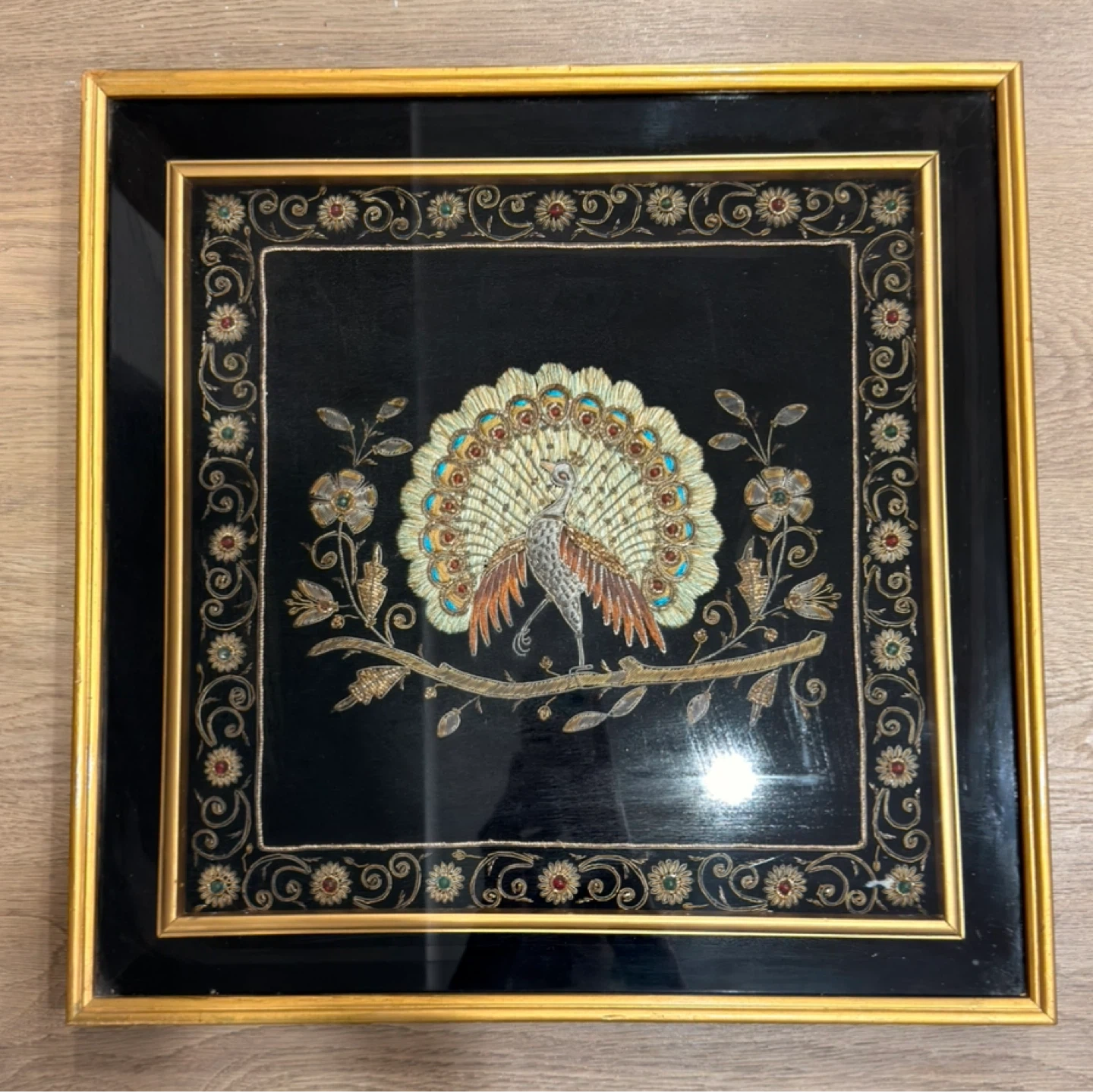 This framed art features a detailed embroidered peacock design on a black background. The frame is gold-coloured and has ornate embroidered accents around the border. It's a unique decorative piece.