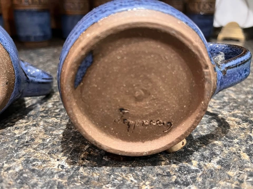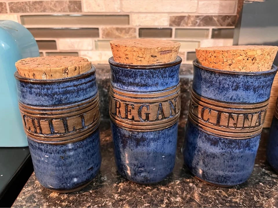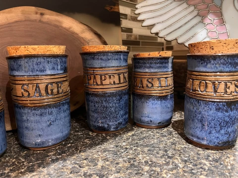These are unique, handcrafted studio pottery pieces, each artist-signed. They are in perfect condition and would be a showstopper for a country or boho chic kitchen. Each piece is 4-4.5 inches tall. Makes a great shower or birthday gift!