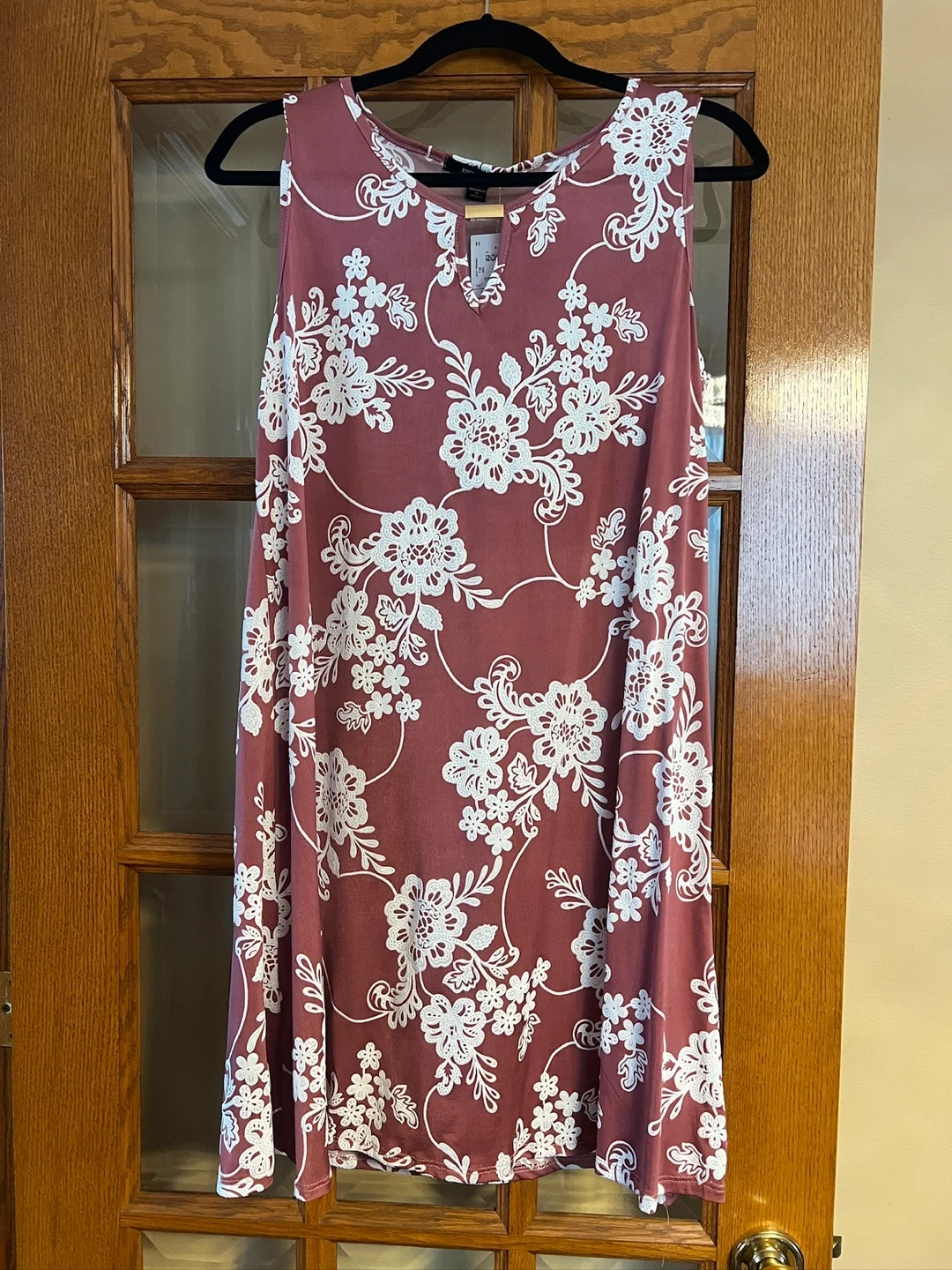 This is a brand new Espresso sleeveless dress with a lovely white floral print on a deep salmon background. It's a size Large and features a keyhole neckline. A great casual option for warmer weather! The dress is very full free-flowing and flattering. Item comes from a pet and smoke free home. Port union/401/Pickering for pick up.