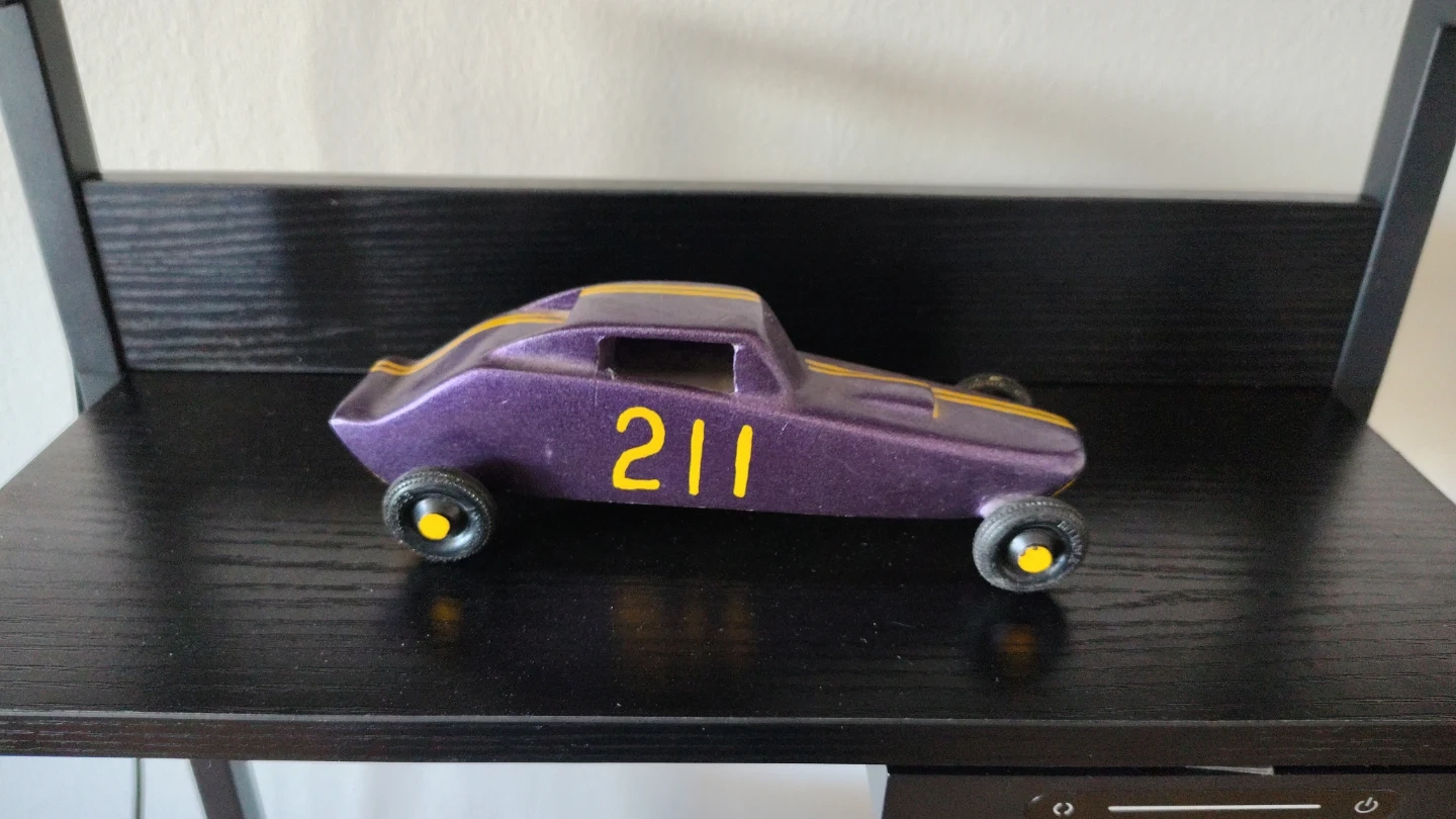 Two decorative wooden toy race cars, one purple with yellow numbering '211' and the other black with 'GREEN MACHINE' written on the side. These look like they could be pinewood derby cars.